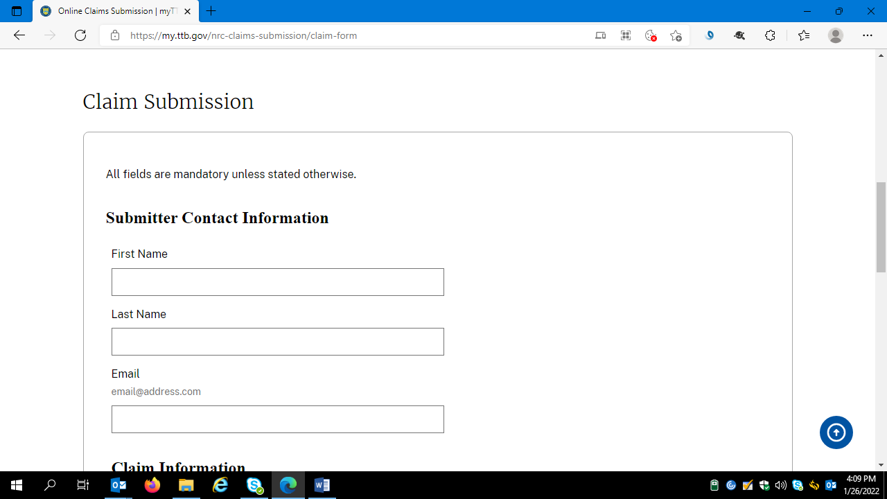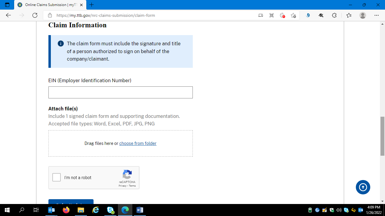 Respondents complete the Claim Information data fields and attach a copy of one completed and signed TTB F 5620.8, along with any required supporting documents: