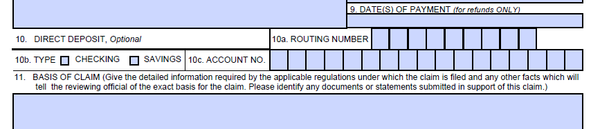 The figures below show the previous version of Item 10 and its instructions on TTB F 5620.8, which allowed the respondent to provide direct deposit information as an option for the payment of drawback or refund of tax: