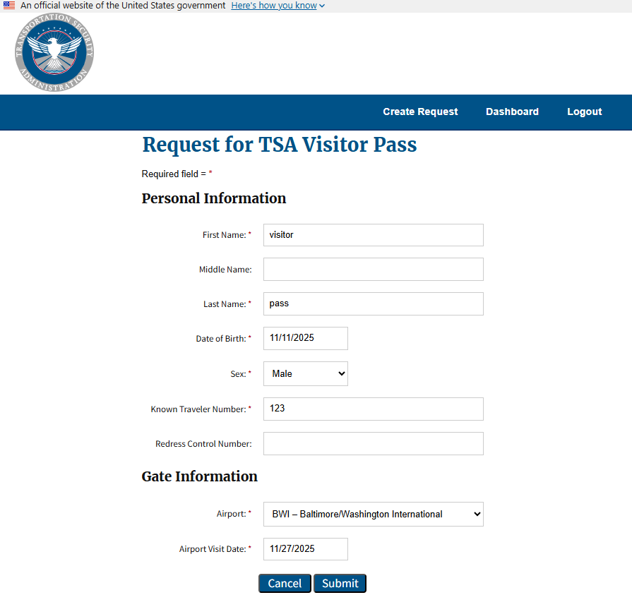 Paperwork Reduction Act Statement: TSA is collecting this information to allow non-traveling individuals to request authorization to enter a sterile area at a U.S. airport. The public burden for this voluntary collection of information is estimated to be approximately 2 minutes. An agency may not conduct or sponsor, and persons are not required to respond to a collection of information, unless it displays a valid OMB control number. The OMB control number assigned to this collection is 1652-0046, which expires 03/31/2026. Send comments regarding this burden estimate or collection to: TSA-11, Attention: PRA 1652-0058, Secure Flight Program, 6595 Springfield Center Drive, Springfield, VA 20598-6011.