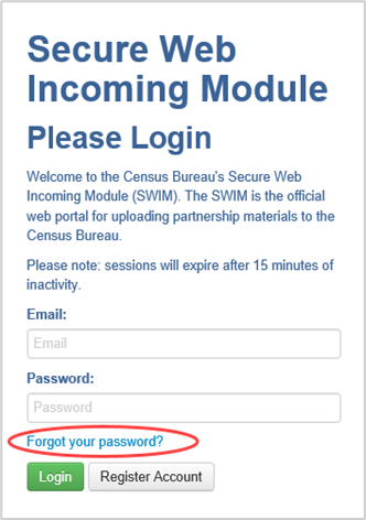 Users that cannot recover their password through the “Forgot your Password?” link should email <geo.bas@census.gov> with the subject line “SWIM Account Assistance” with a brief description of the issue.