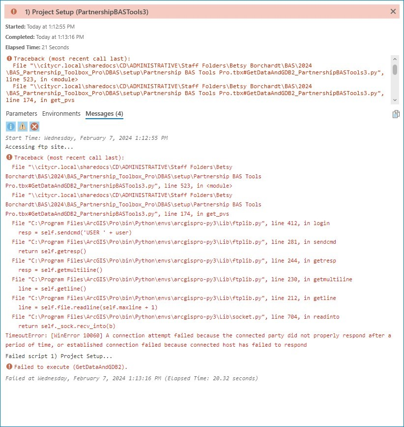 An error like the one below may occur due to network settings or firewall restrictions. In this occurs, download the partnership shapefiles from the BAS website and use the offline mode of the toolbox as described in section 2.3.1.