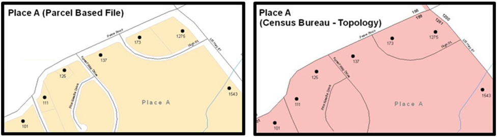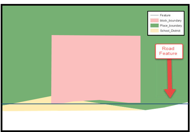 In a GIS, feature classes are often not topologically integrated; instead, they are separated into individual datasets. When these datasets are overlaid in a GIS, there may be boundary misalignments. These non-topologically integrated datasets could cause issues in the MAF/TIGER System. Figure 2 shows how files that are not topologically integrated might appear in a GIS when overlaid.