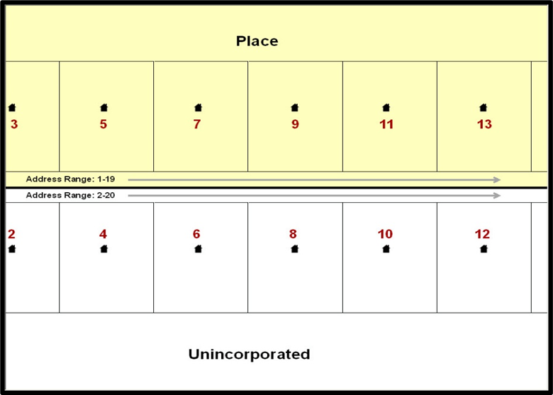 When it is not possible to collect an MSP, the Census Bureau codes houses and living quarters according to the address range associated with the adjacent stretch of road (Figure 5). Address ranges describe a label given to a unique collection of addresses that fall along a road or path. Address ranges provide a way of locating homes and business based on their street address when no other location information is available. The Census Bureau conducts numerous operations and processes to build and maintain high quality address ranges.