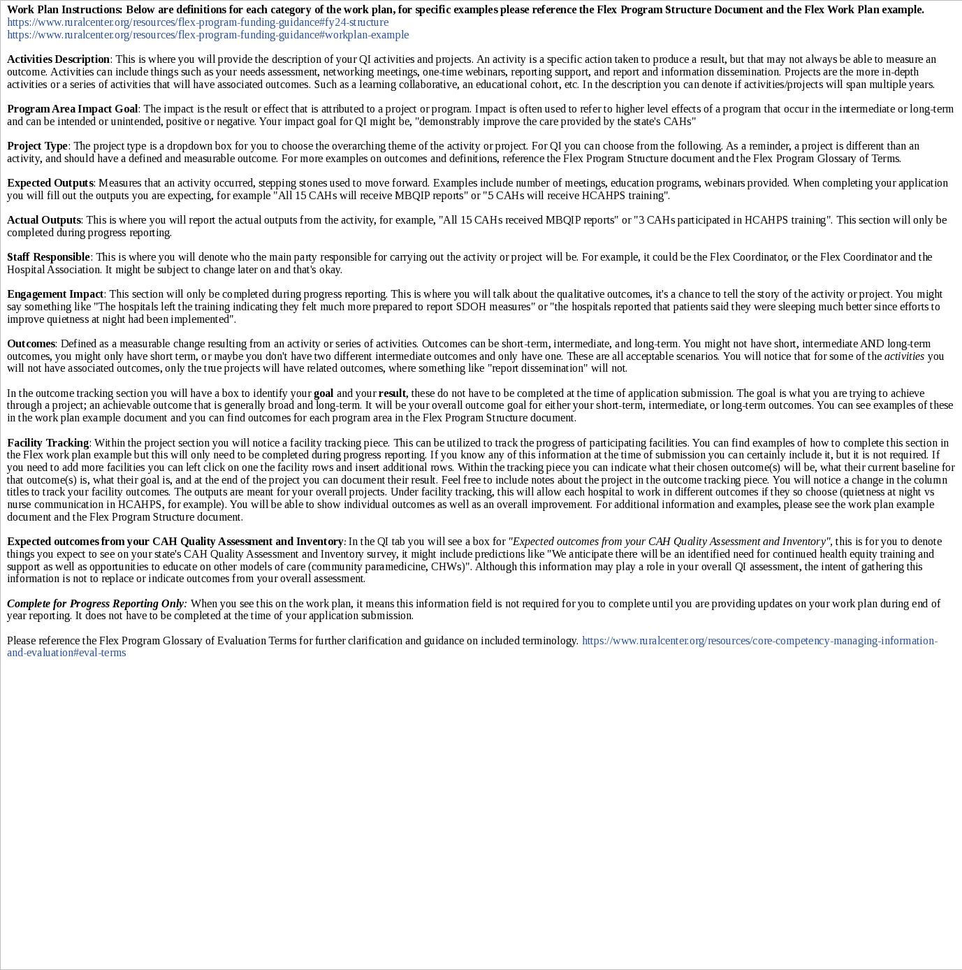 | The workplan is a separate document from the text-based Project Narrative. It is a succinct overview of the program objectives, goals, activities, and projected outcomes in table format. The work plan is not a narrative. The work plan is organized by the Flex program areas and activity categories listed in the document Medicare Rural Hospital Flexibility Program Structure for FY 2024 - FY 2029. This is a work plan for FY24, or year 1, but it is intended to be a planning document for you to look forward to all 5 years, and document outcomes as such. FORHP does not expect you to have a completed plan for all 5 years. Only include the program areas and activity categories in the work plan that will be part of your state Flex Program. All other areas and activity categories should be removed from this work plan template prior to submission. |