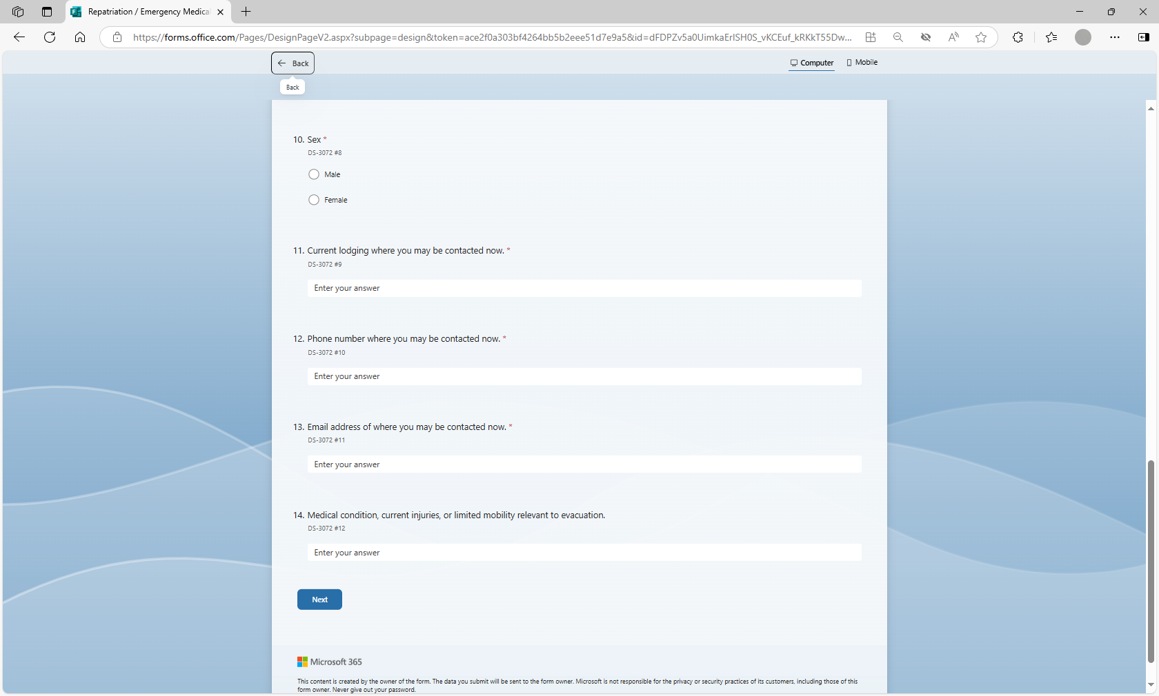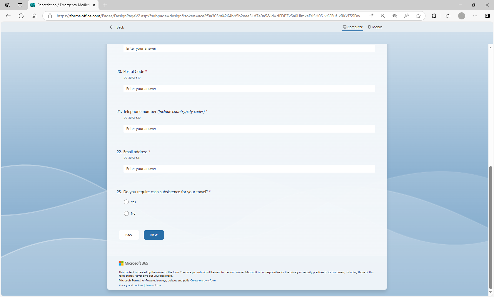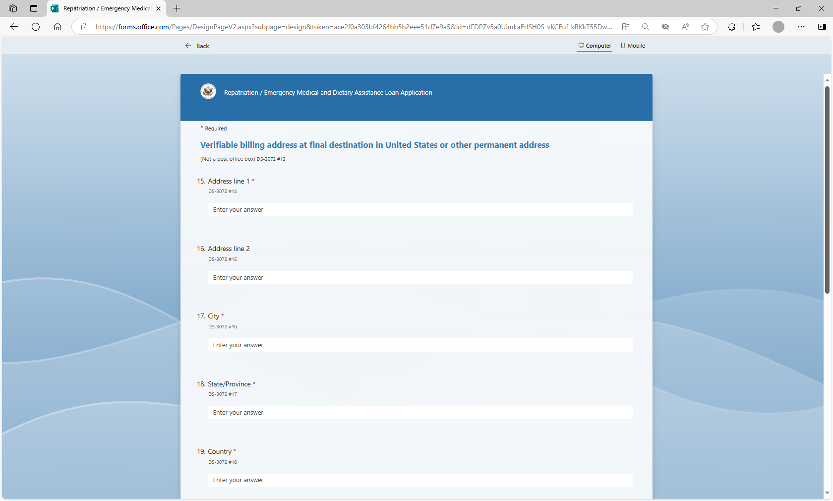 The MS form will be utilized by loan applicants to more efficiently submit their information for a repatriation or EMDA loan application to U.S. posts abroad. Posts will utilize the MS Forms tool to auto populate the form DS-3072 to prepare the form prior to the applicant’s arrival at the U.S. Consulate or Embassy, thereby streamlining the application review and approval process.