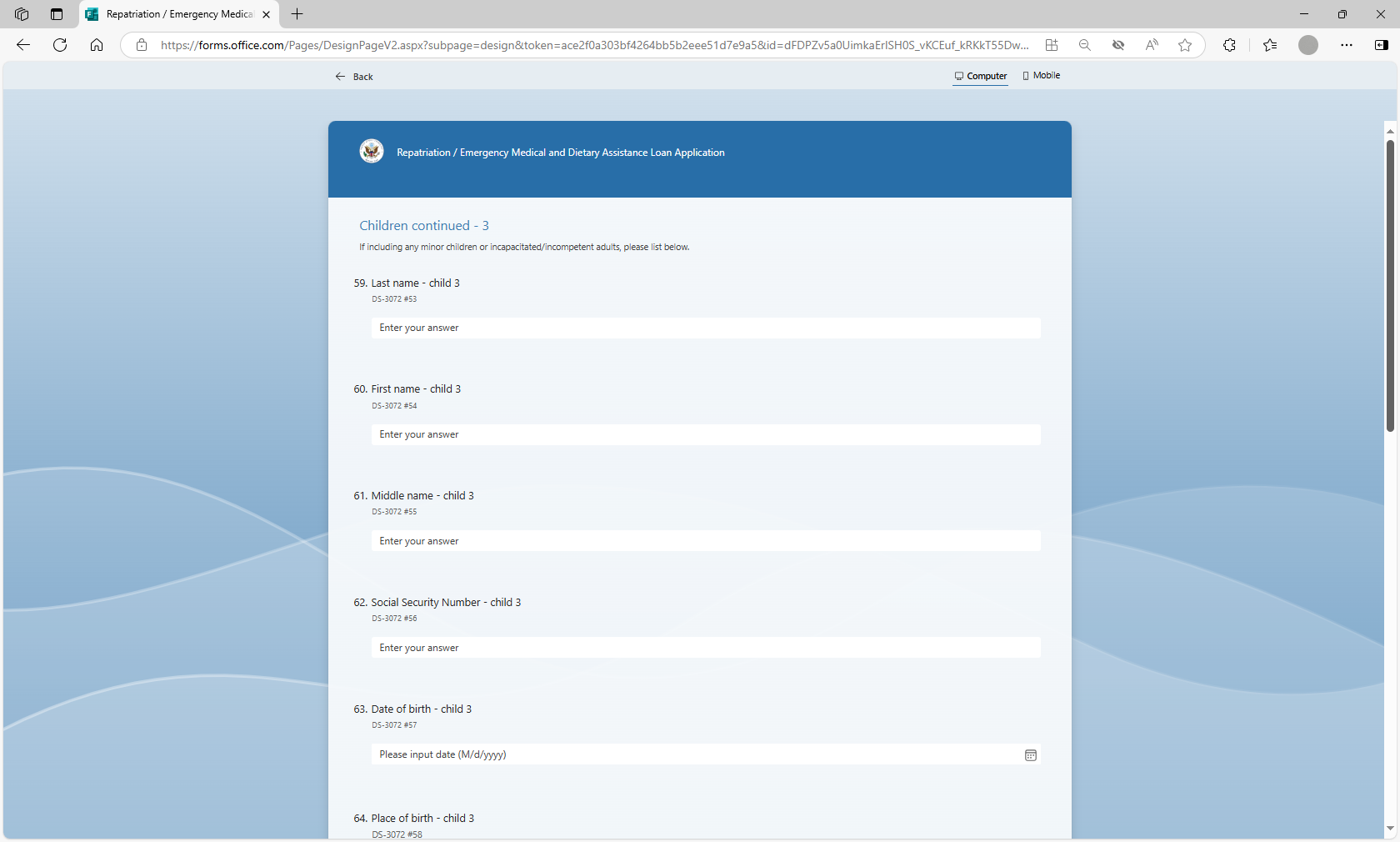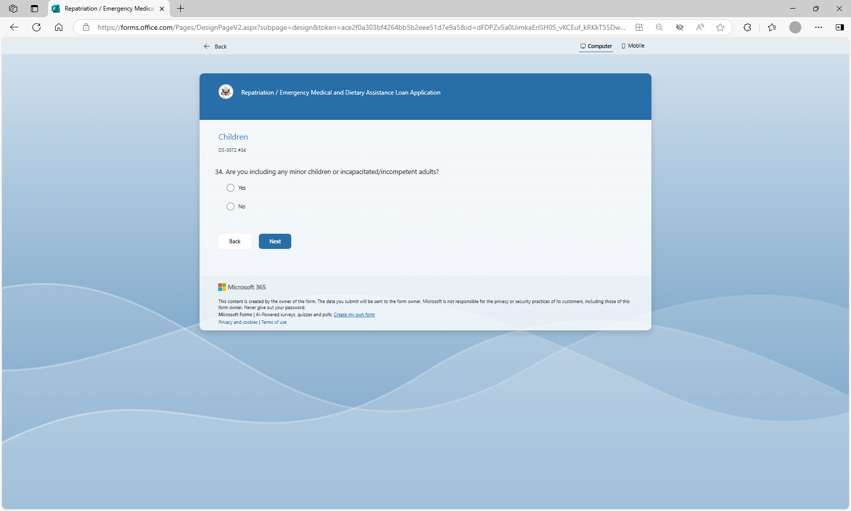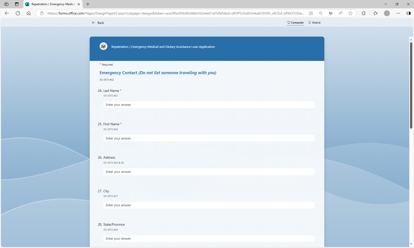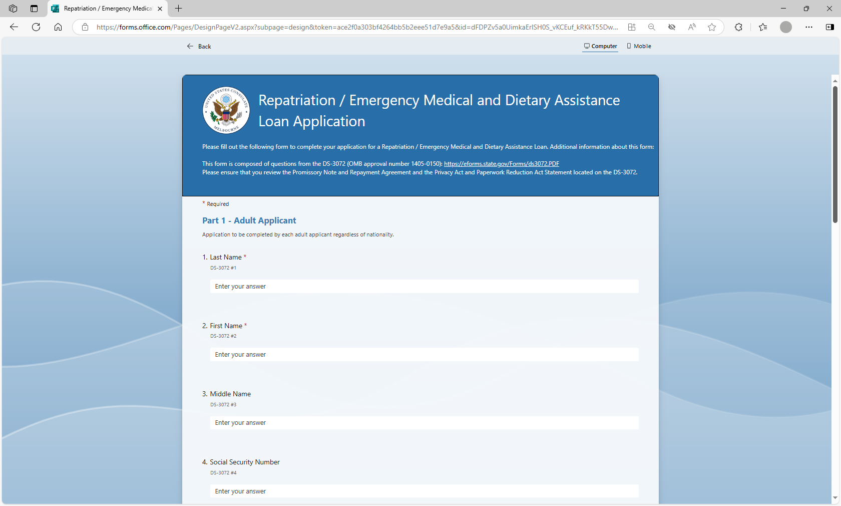 The MS form will be utilized by loan applicants to more efficiently submit their information for a repatriation or EMDA loan application to U.S. posts abroad. Posts will utilize the MS Forms tool to auto populate the form DS-3072 to prepare the form prior to the applicant’s arrival at the U.S. Consulate or Embassy, thereby streamlining the application review and approval process.