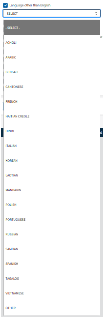 Acholi/Arabic/Bengali/Cantonese/French/Haitian/Creole/Hindi/Italian/Korean/Laotian/Mandarin/Polish/Portuguese/Russian/Samoan/Spanish/Tagalog/Vietnamese/Other