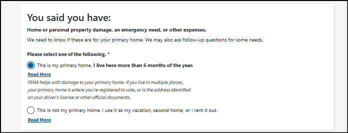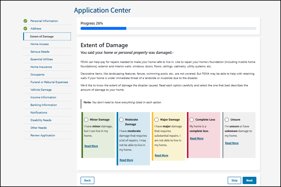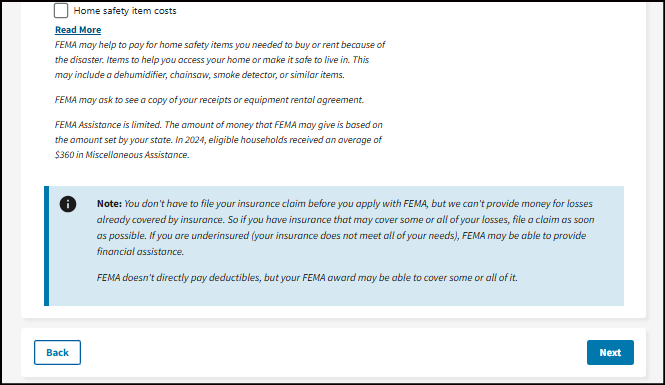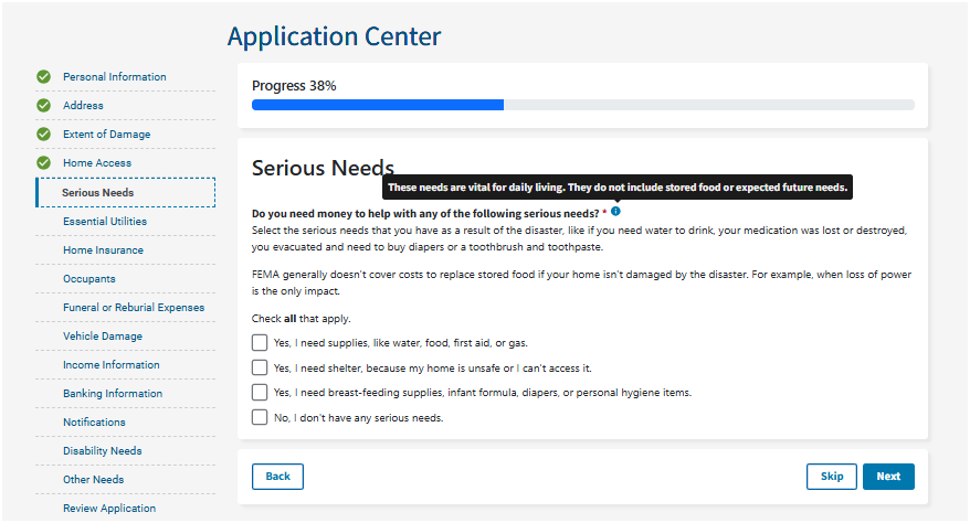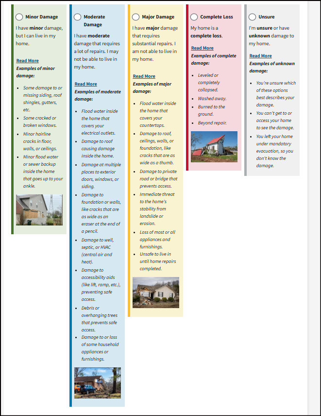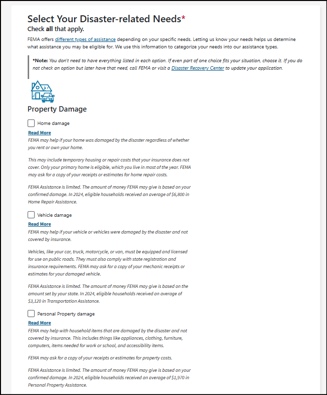 *Note: You don't need to have everything listed in each option. If even part of one choice fits your situation, choose it. If you do not check an option but later have that need, call FEMA or visit a Disaster Recovery Center to update your application.