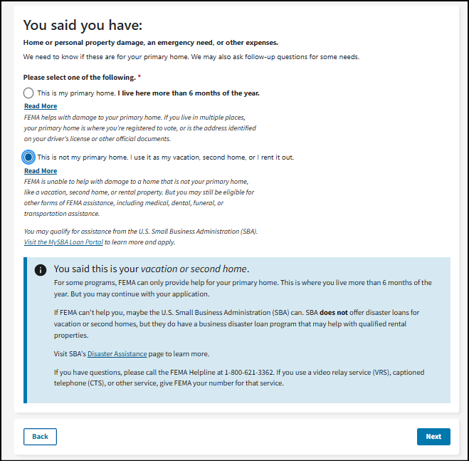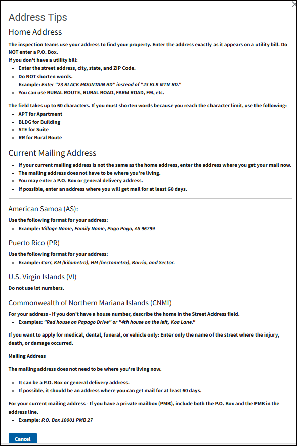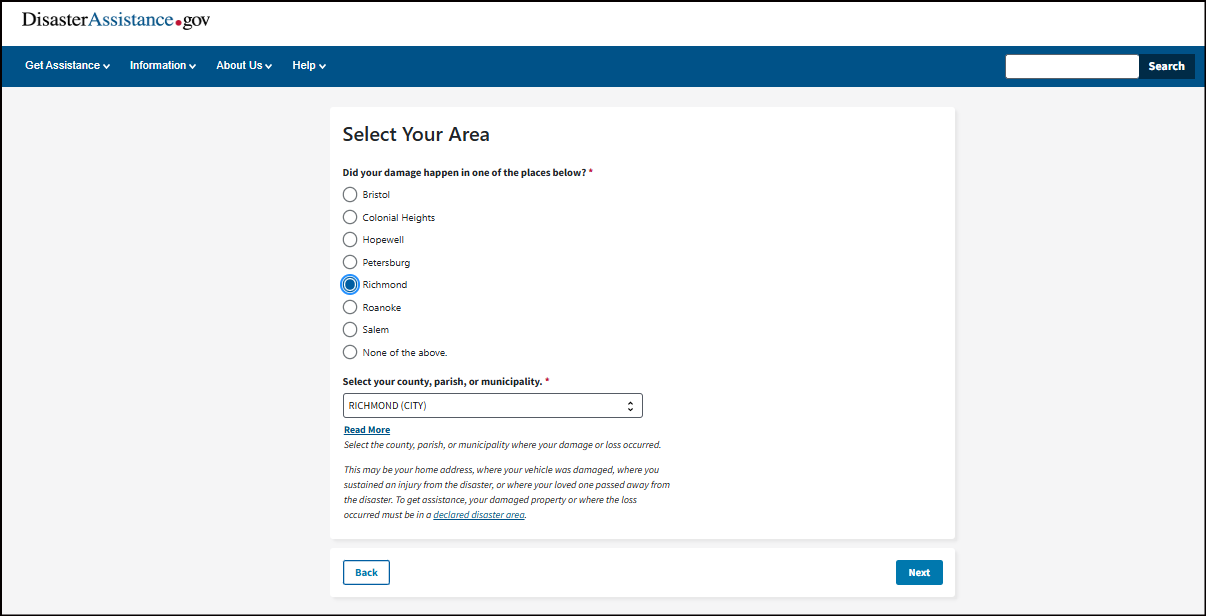 This may be your home address, where your vehicle was damaged, where you sustained an injury from the disaster, or where your loved one passed away from the disaster. To get assistance, your damaged property or where the loss occurred must be in a declared disaster area.