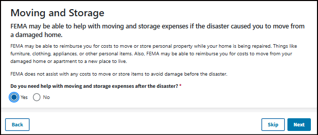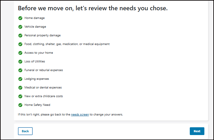FEMA offers different types of assistance depending on your specific needs. Letting us know your needs helps us determine what assistance you may be eligible for. We use this information to categorize your needs into our assistance types.