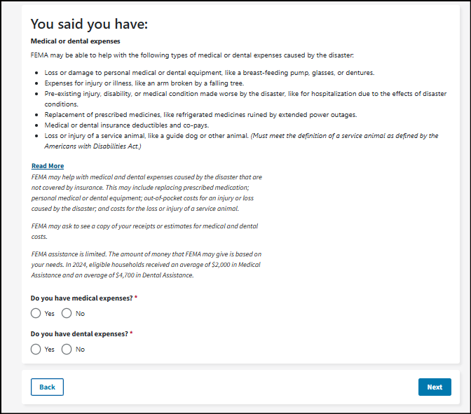 FEMA may help with medical and dental expenses caused by the disaster that are not covered by insurance. This may include replacing prescribed medication; personal medical or dental equipment; out-of-pocket costs for an injury or loss caused by the disaster; and costs for the loss or injury of a service animal.