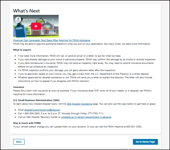 You will return to DisasterAssistance.gov to finish and submit your application to FEMA.