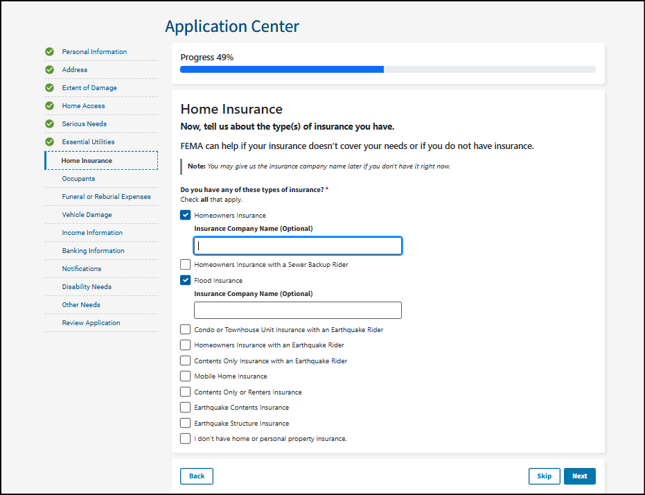 Note: You don't have to file your insurance claim before you apply with FEMA, but we can't provide money for losses already covered by insurance. So if you have insurance that may cover some or all of your losses, file a claim as soon as possible. If you are underinsured (your insurance does not meet all of your needs), FEMA may be able to provide financial assistance.