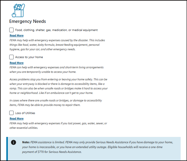 Note: FEMA assistance is limited. FEMA may only provide Serious Needs Assistance if you have damage to your home, your home is inaccessible, or you have an extended utility outage. Eligible households will receive a one-time payment of $770 for Serious Needs Assistance.