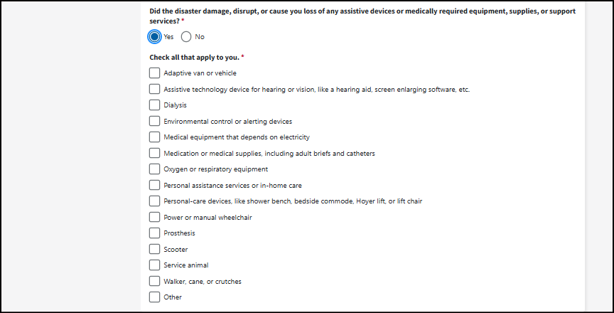 Did the disaster damage, disrupt, or cause you loss of any assistive devices or medically required equipment, supplies, or support services? *