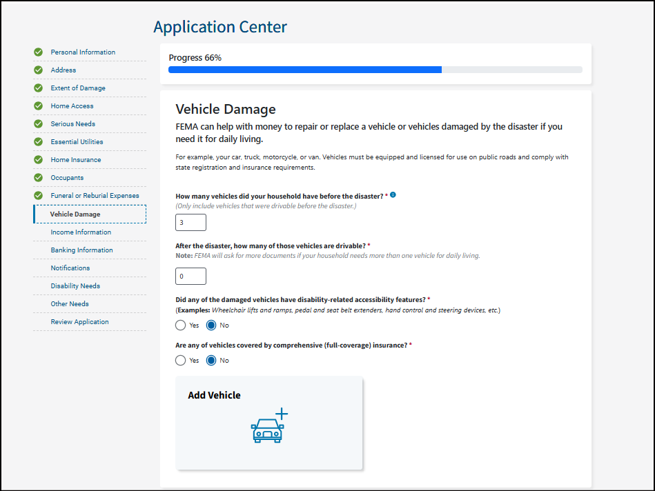 Vehicles, like your car, truck, motorcycle, or van, must be equipped and licensed for use on public roads. They must also comply with state registration and insurance requirements. FEMA may ask for a copy of your mechanic receipts or estimates for your damaged vehicle.