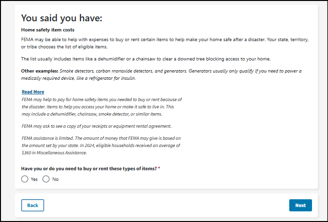 FEMA may help to pay for home safety items you needed to buy or rent because of the disaster. Items to help you access your home or make it safe to live in. This may include a dehumidifier, chainsaw, smoke detector, or similar items.