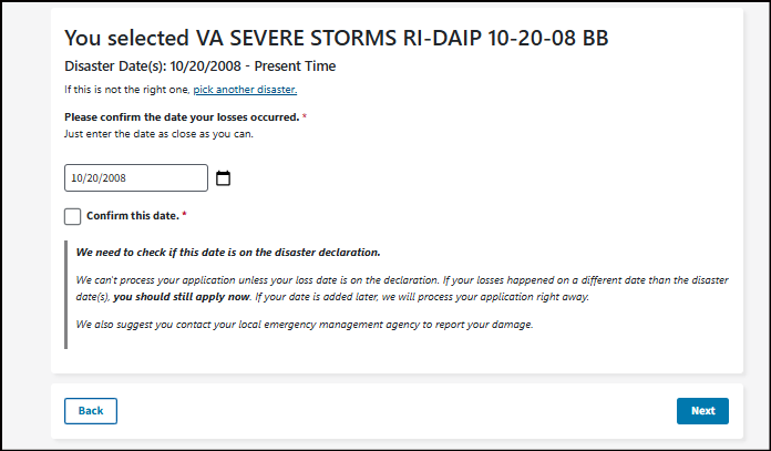 You are applying for VA SEVERE STORMS RI-DAIP 10-20-08 BB that occurred 10/20/2008 - Present Time.