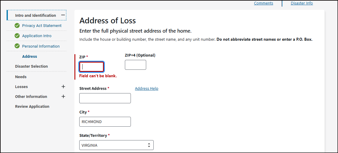 This may be your home address, where your vehicle was damaged, where you sustained an injury from the disaster, or where your loved one passed away from the disaster. To get assistance, your damaged property or where the loss occurred must be in a declared disaster area.