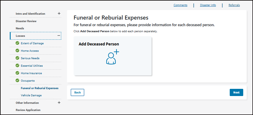 Other Needs Assistance - This can help with some immediate needs when you can't live in your home. It may cover certain losses and expenses caused by the disaster. Things like personal property and vehicle losses; medical, dental, child care, moving and storage, and funeral expenses."