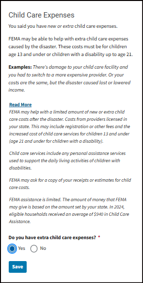 Other Needs Assistance - This can help with some immediate needs when you can't live in your home. It may cover certain losses and expenses caused by the disaster. Things like personal property and vehicle losses; medical, dental, child care, moving and storage, and funeral expenses."