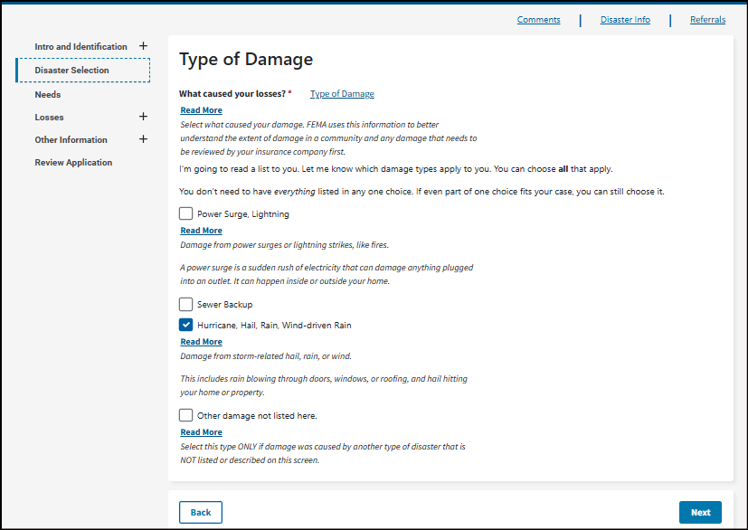 Select what caused your damage. FEMA uses this information to better understand the extent of damage in a community and any damage that needs to be reviewed by your insurance company first.