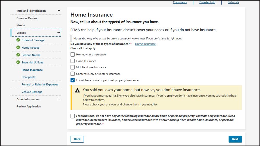 If you have homeowner's insurance, FEMA may not send an inspector right away. You may need to submit insurance documents before we can schedule an inspection.