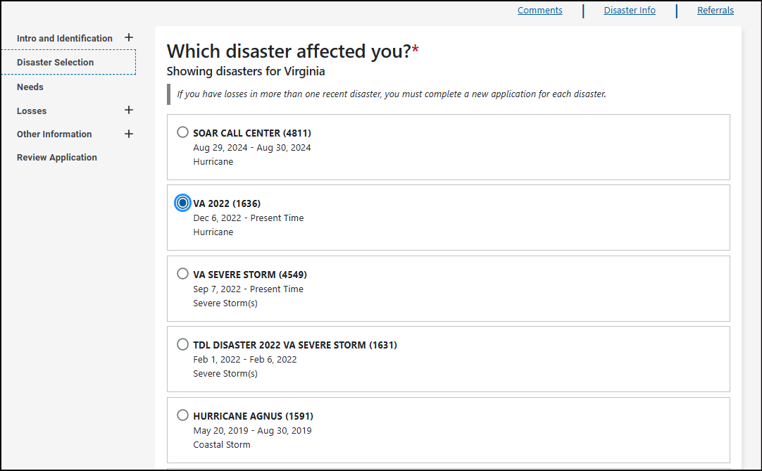 You are applying for VA SEVERE STORM that occurred 09/07/2022 - Present Time.