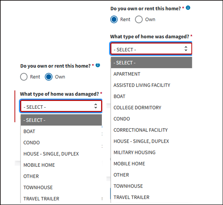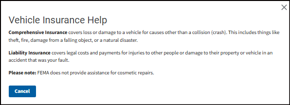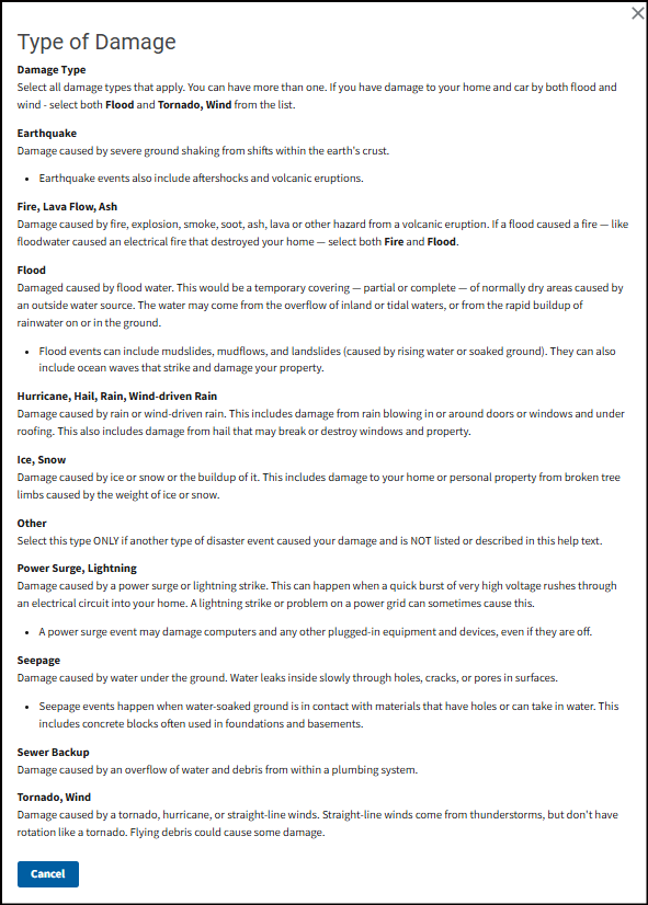 Select what caused your damage. FEMA uses this information to better understand the extent of damage in a community and any damage that needs to be reviewed by your insurance company first.