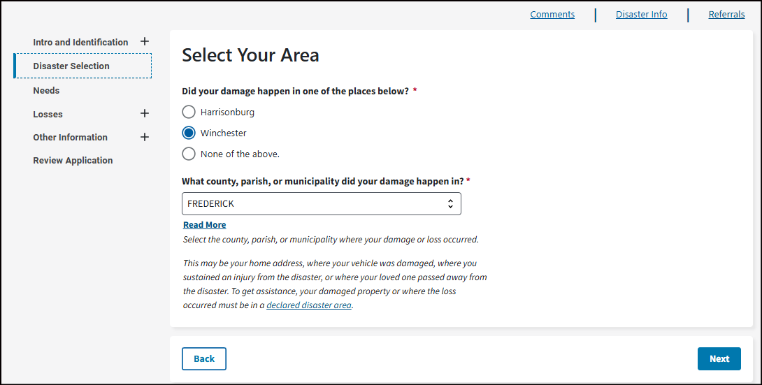 This may be your home address, where your vehicle was damaged, where you sustained an injury from the disaster, or where your loved one passed away from the disaster. To get assistance, your damaged property or where the loss occurred must be in a declared disaster area.
