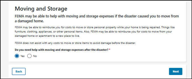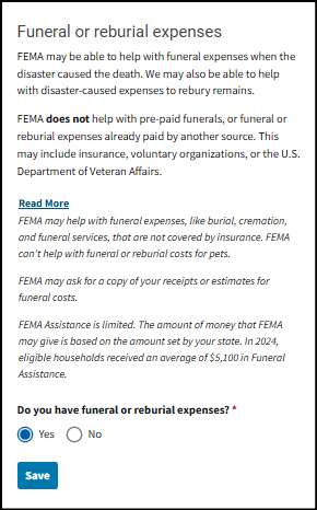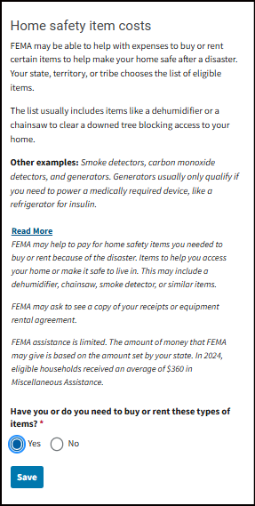 Other Needs Assistance - This can help with some immediate needs when you can't live in your home. It may cover certain losses and expenses caused by the disaster. Things like personal property and vehicle losses; medical, dental, child care, moving and storage, and funeral expenses."