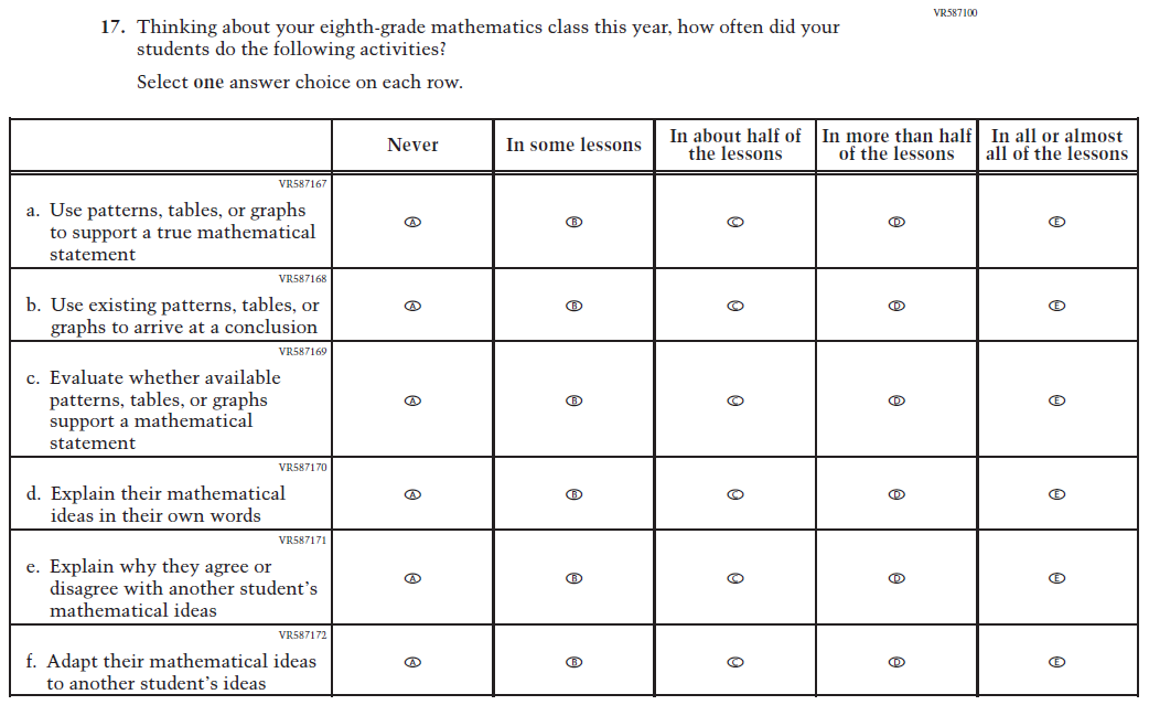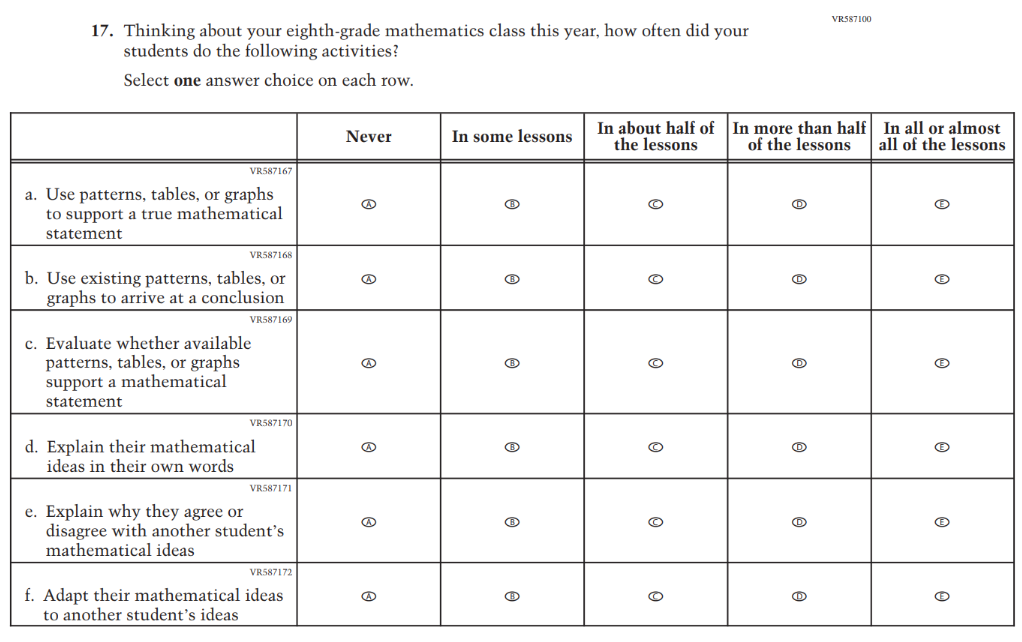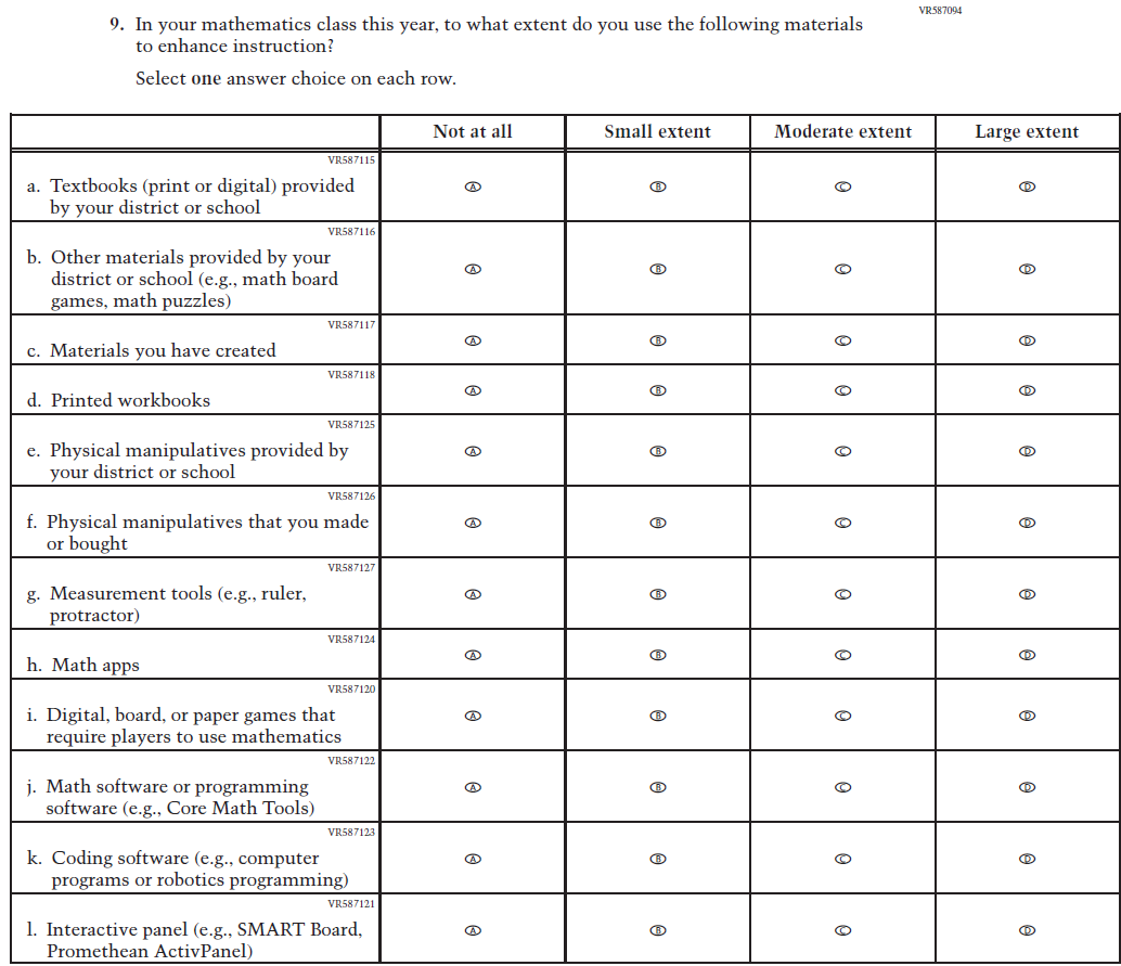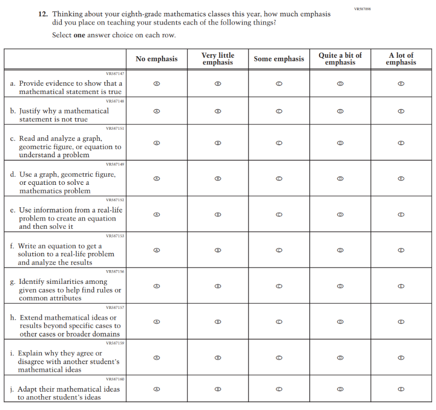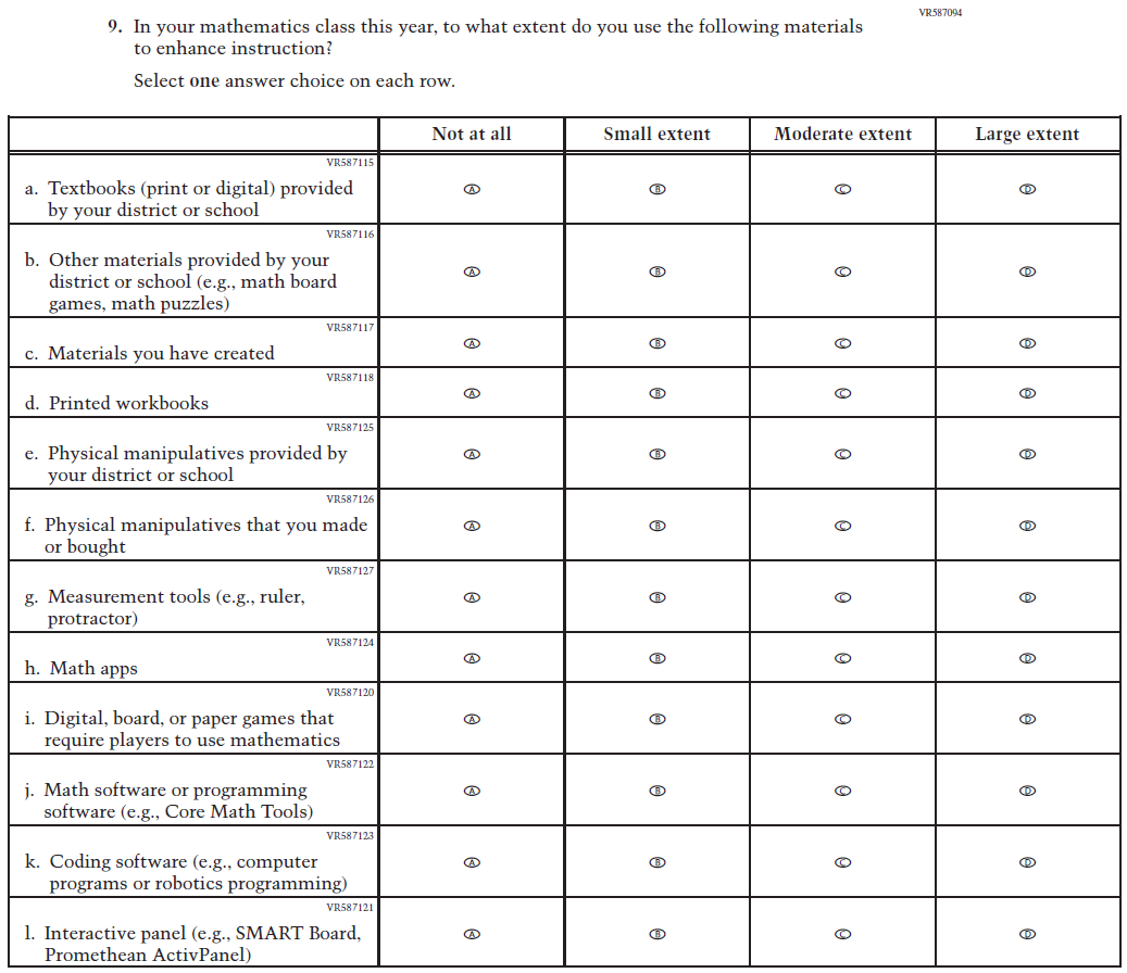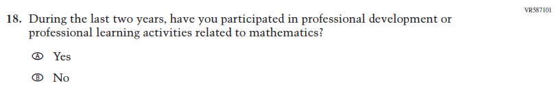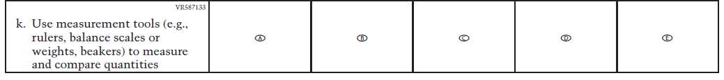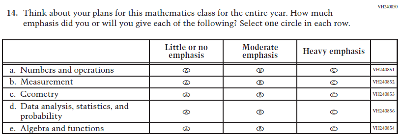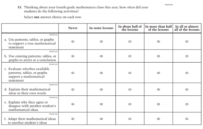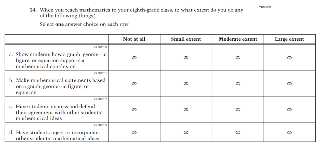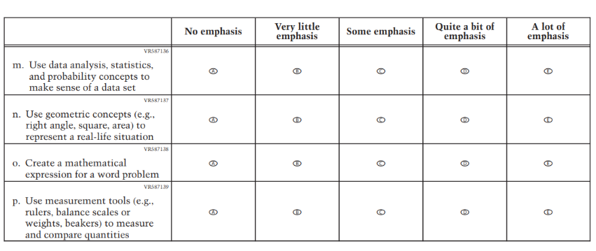 For 2026, we have aligned Inline Directions in Teacher and School Items with the Directions currently used in Student Items. The Item stem was revised for clarity and subitems k-p were developed to measure content aligned with the new Mathematics framework. |