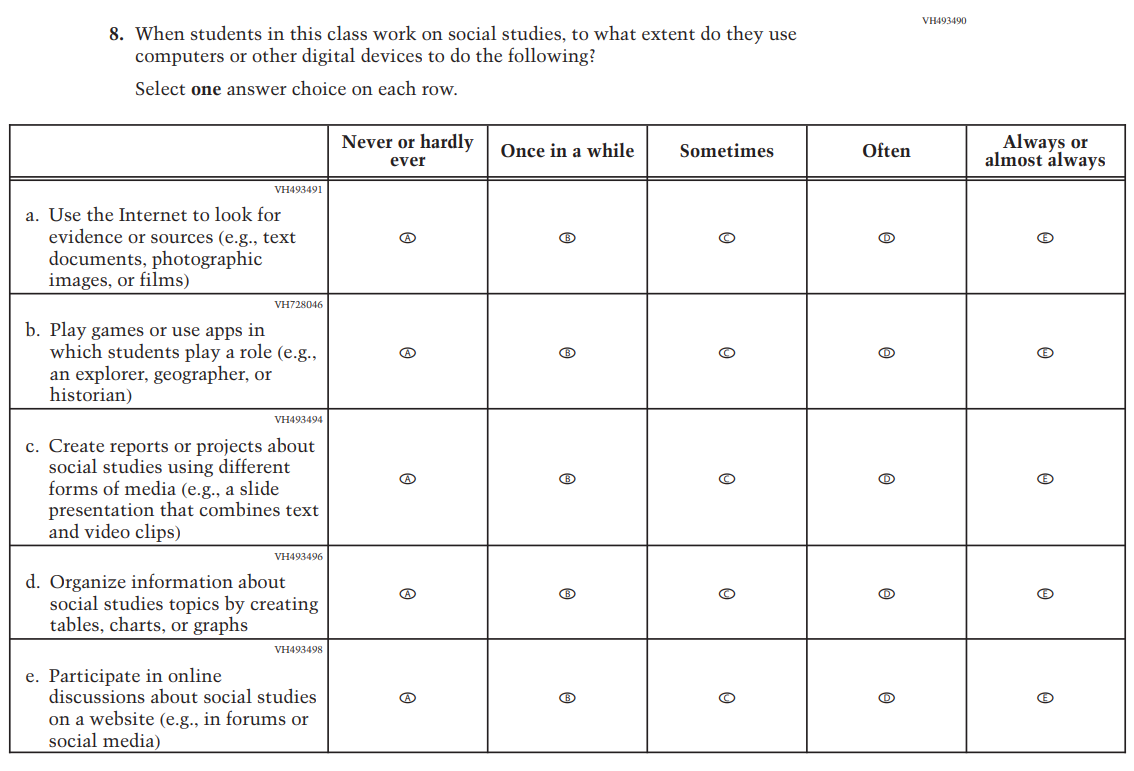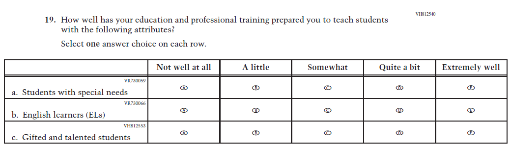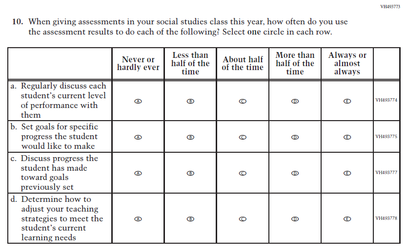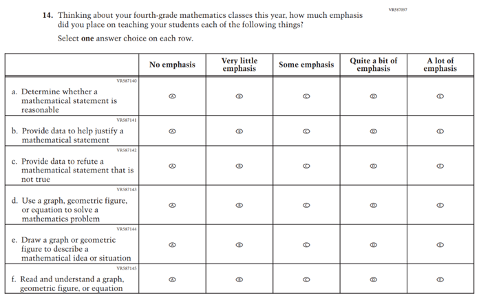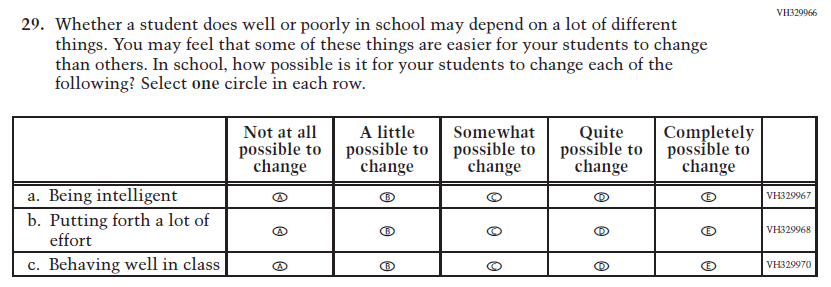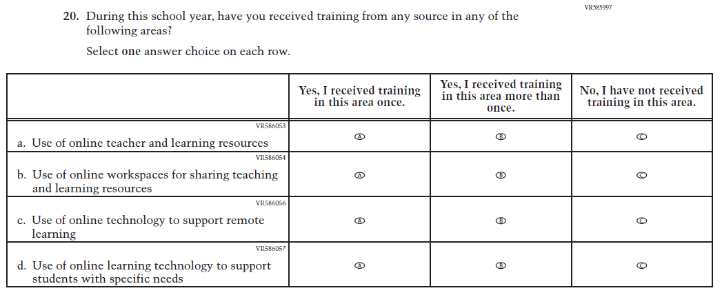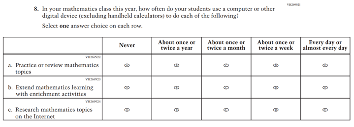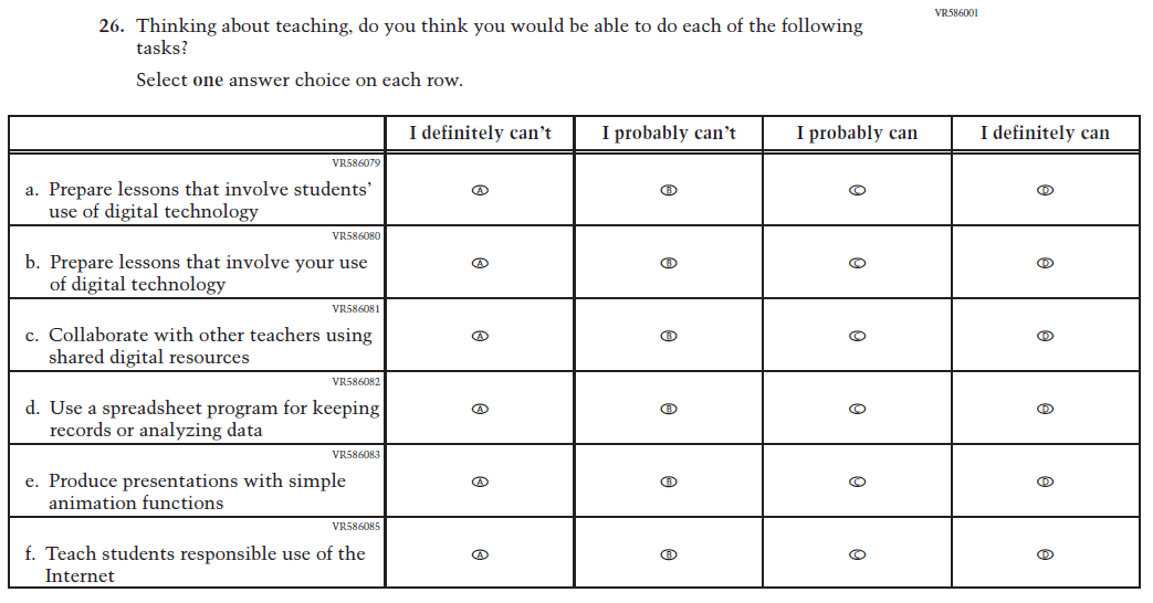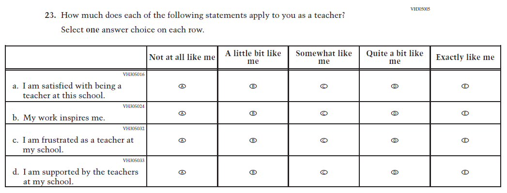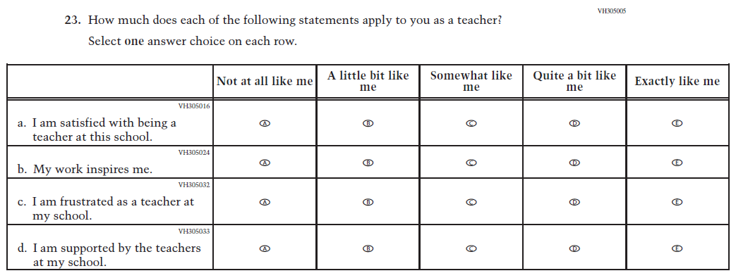 For 2026, we have aligned Inline Directions in Teacher and School Items with the Directions currently used in Student Items. The Item stem was revised for clarity and subItem d was dropped to reduce questionnaire length. |