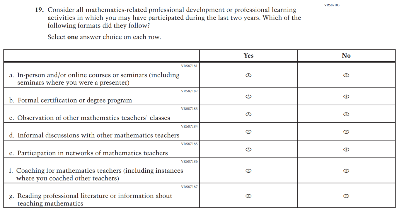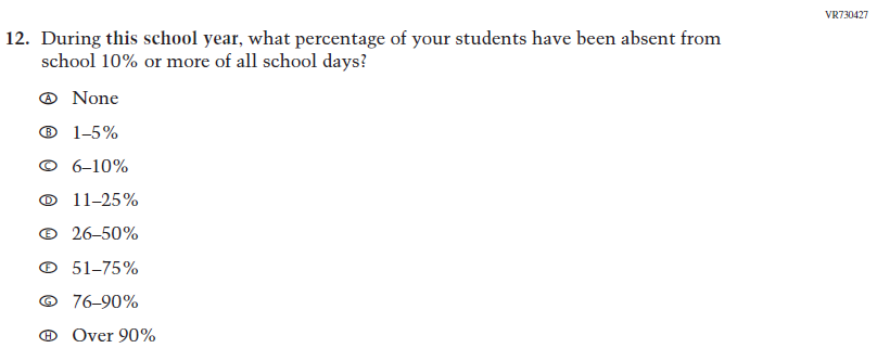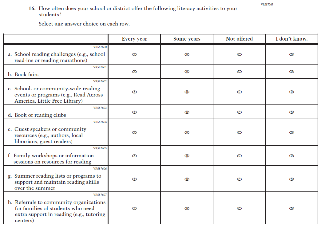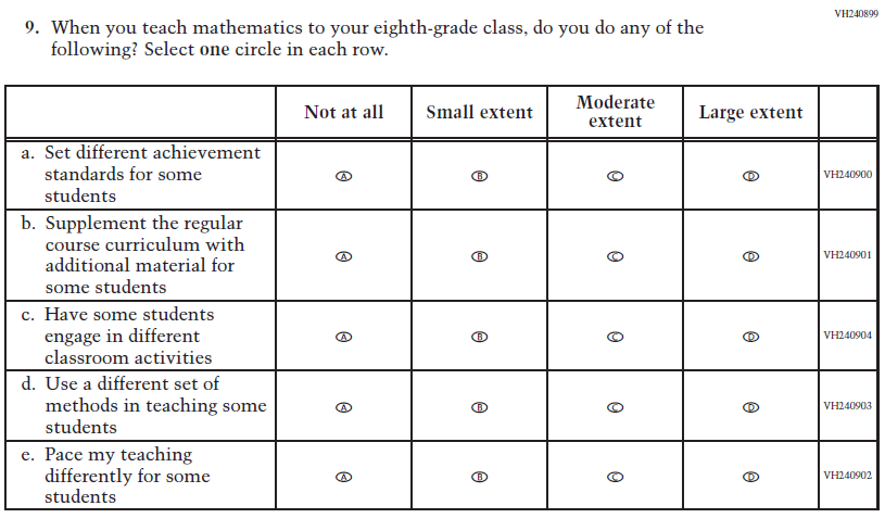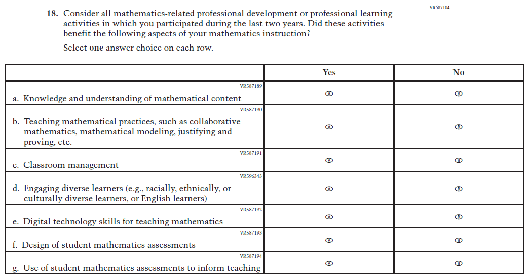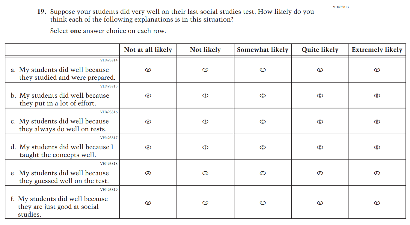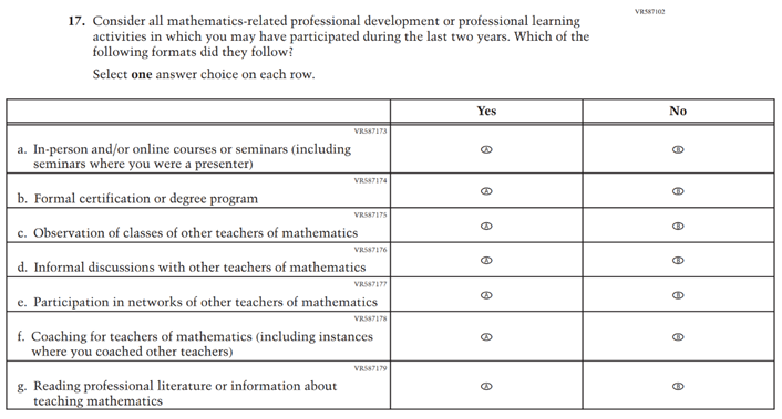 For 2026, we have aligned Inline Directions in Teacher and School Items with the Directions currently used in Student Items. The Item stem was revised for clarity and subItem d was dropped to reduce questionnaire length. |