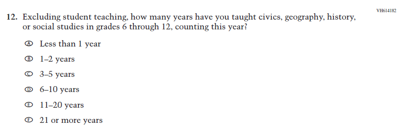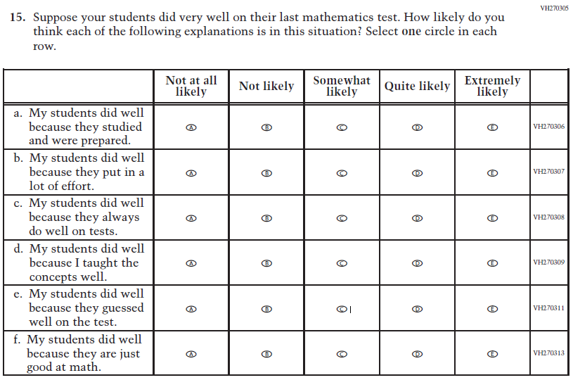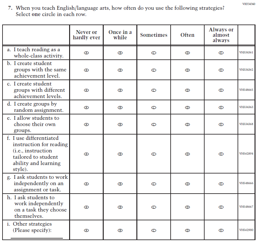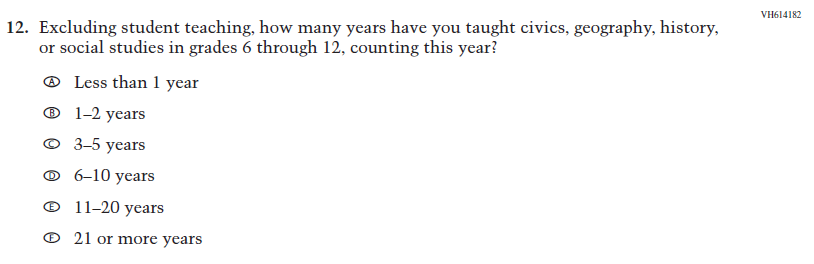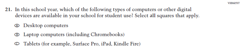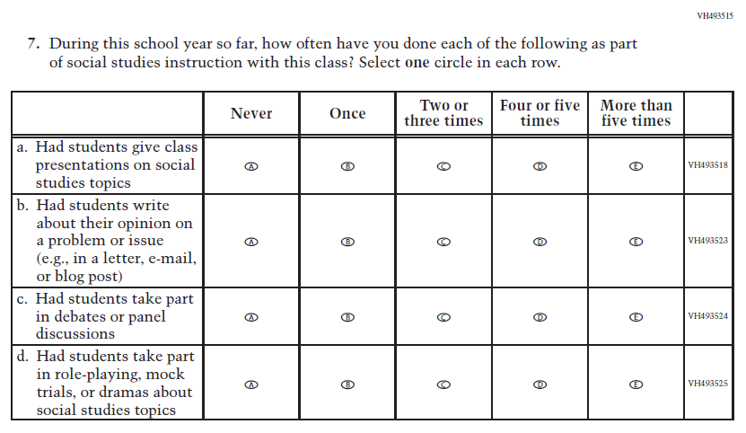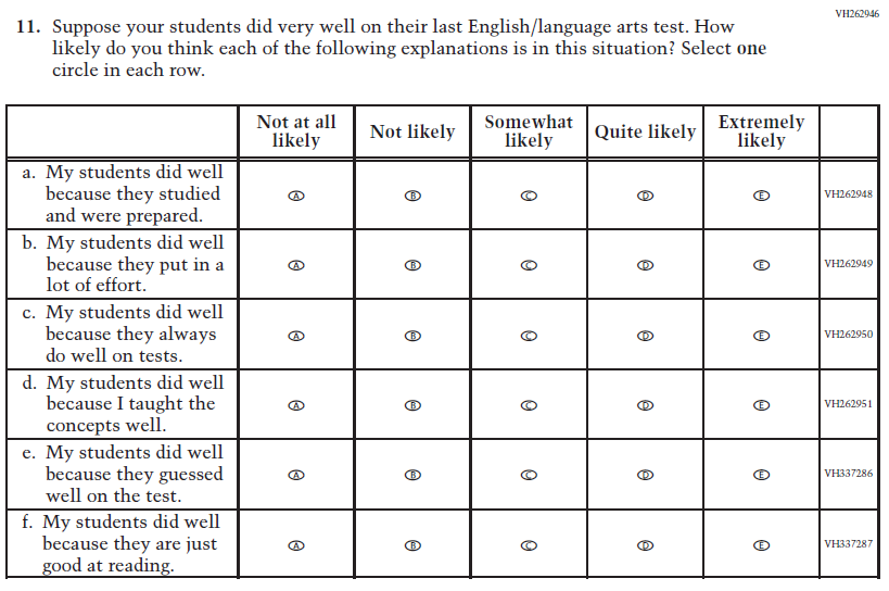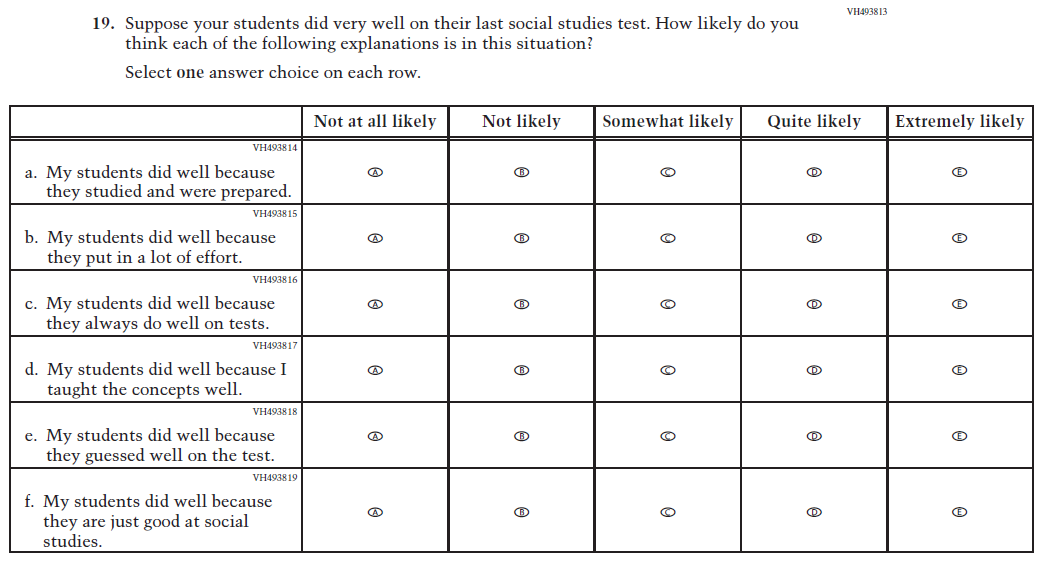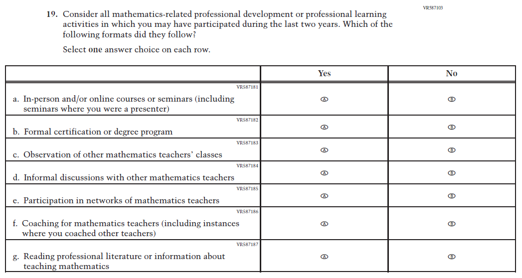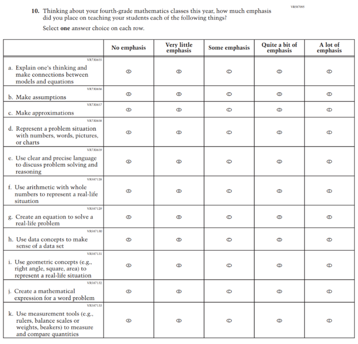 For 2026, we have aligned Inline Directions in Teacher and School Items with the Directions currently used in Student Items. The Item stem was revised for clarity and subItem d was dropped to reduce questionnaire length. |