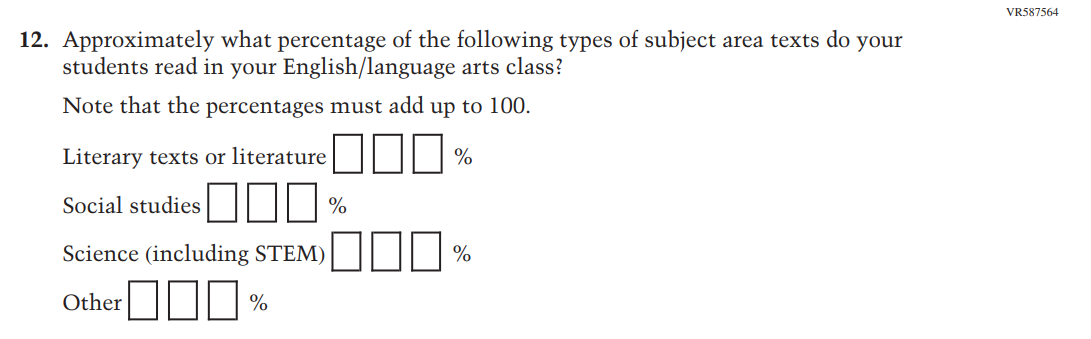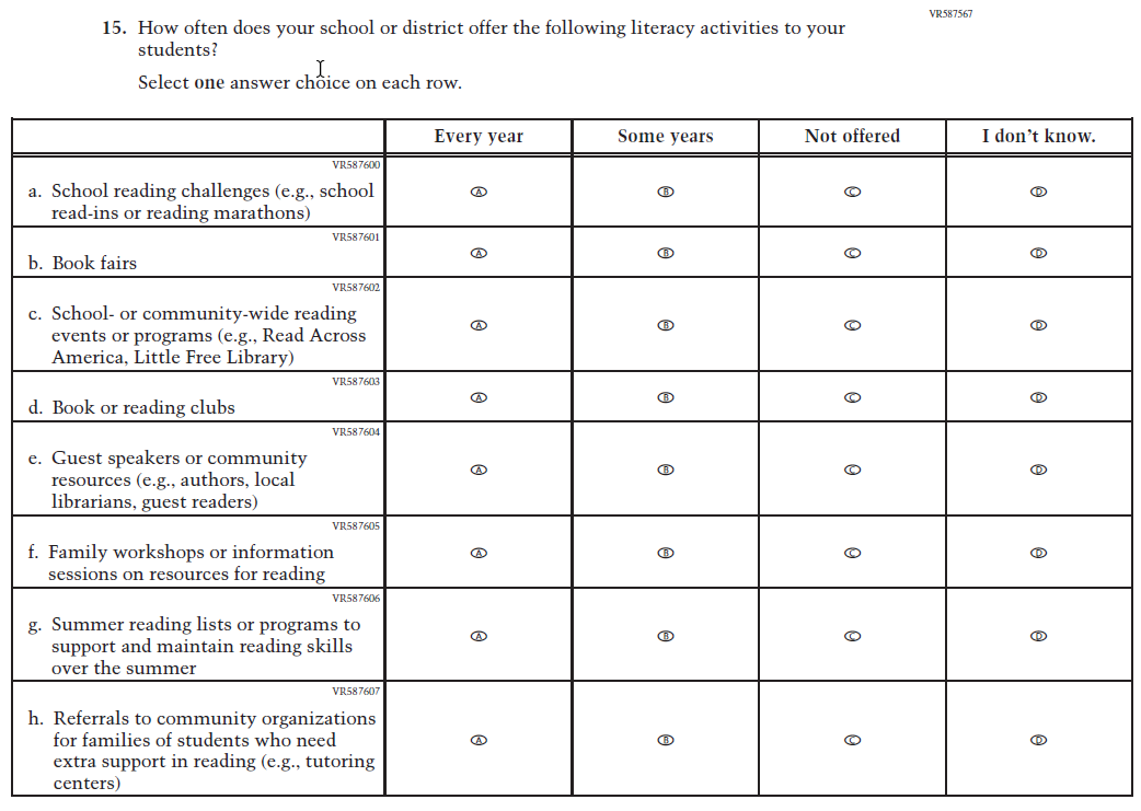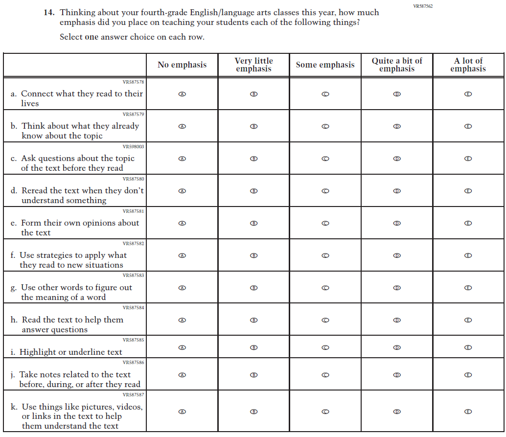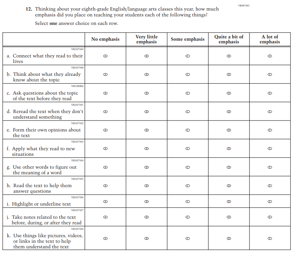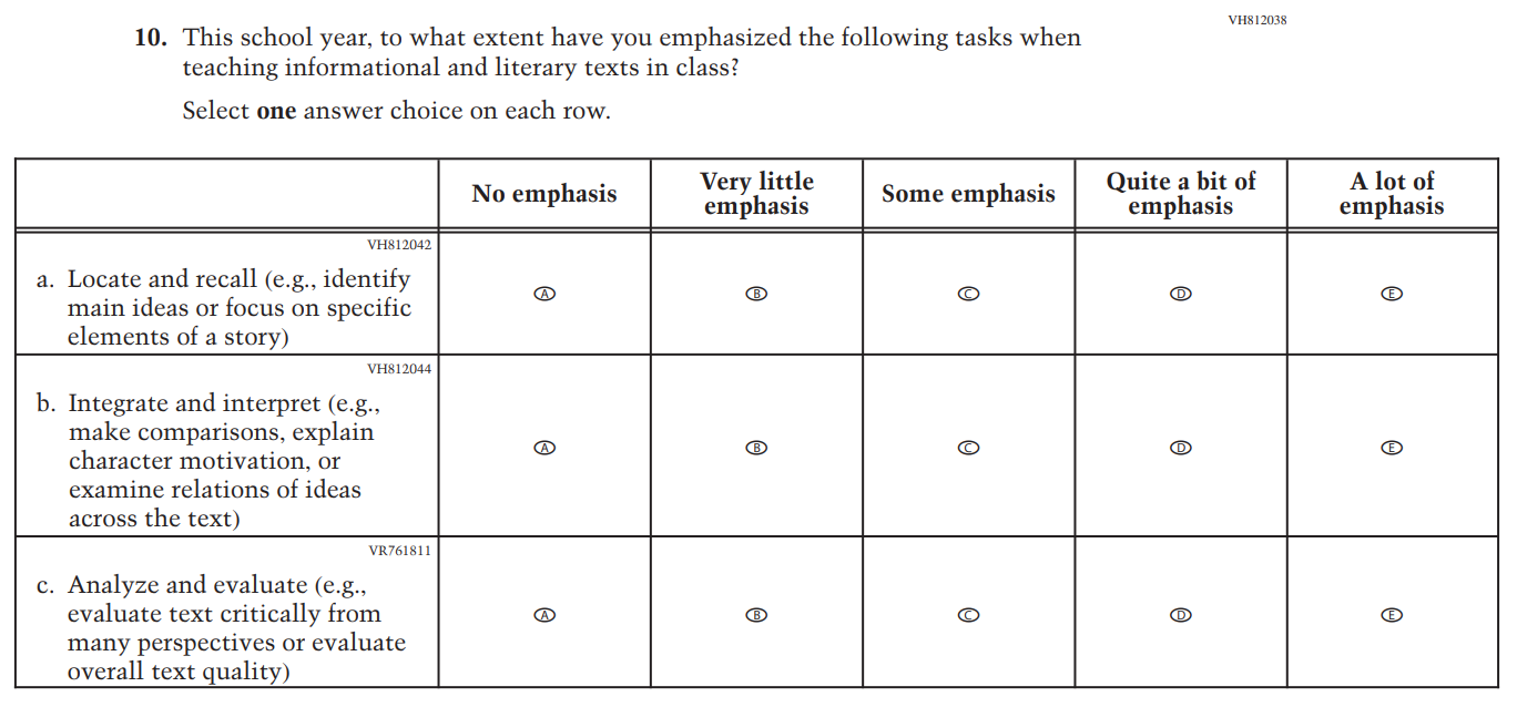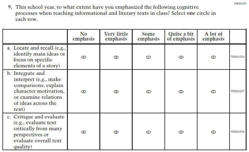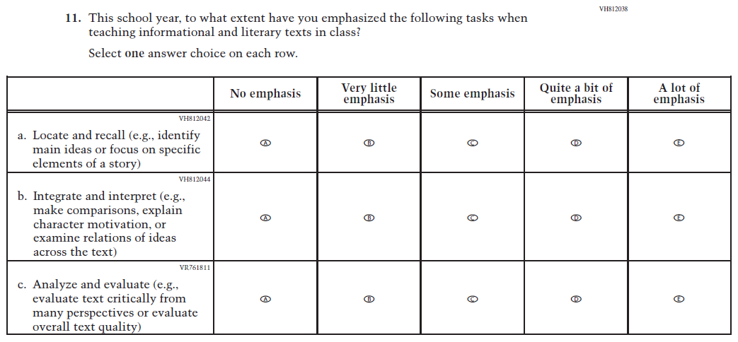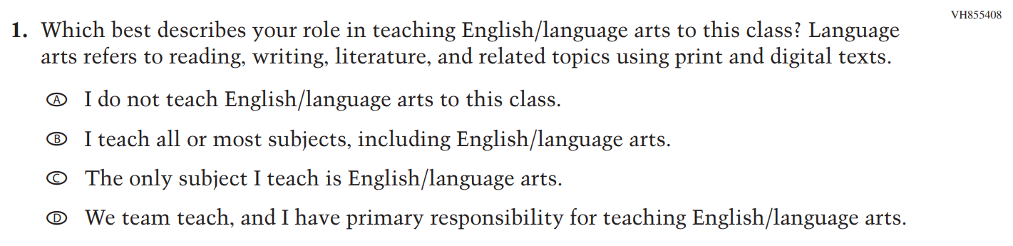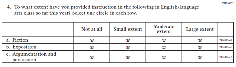 For 2026, we have aligned Inline Directions in Teacher and School Items with the Directions currently used in Student Items. Subitems a, b, c, and d were revised for clarity and subitem h was developed to measure content aligned with the new Reading framework. |