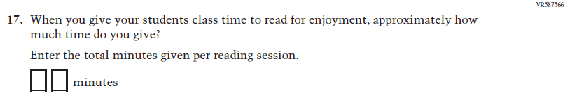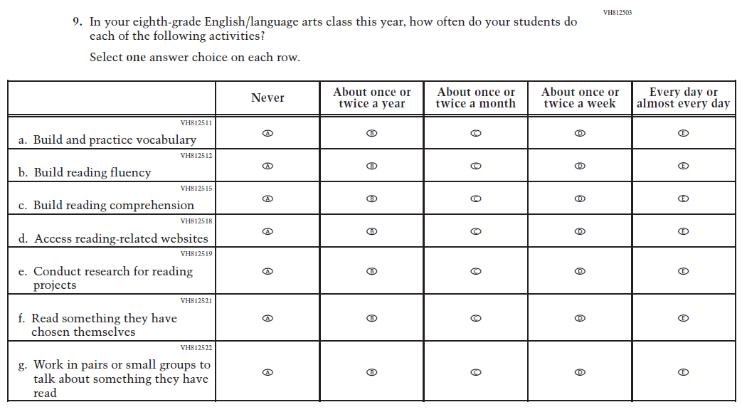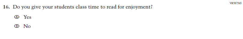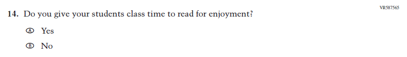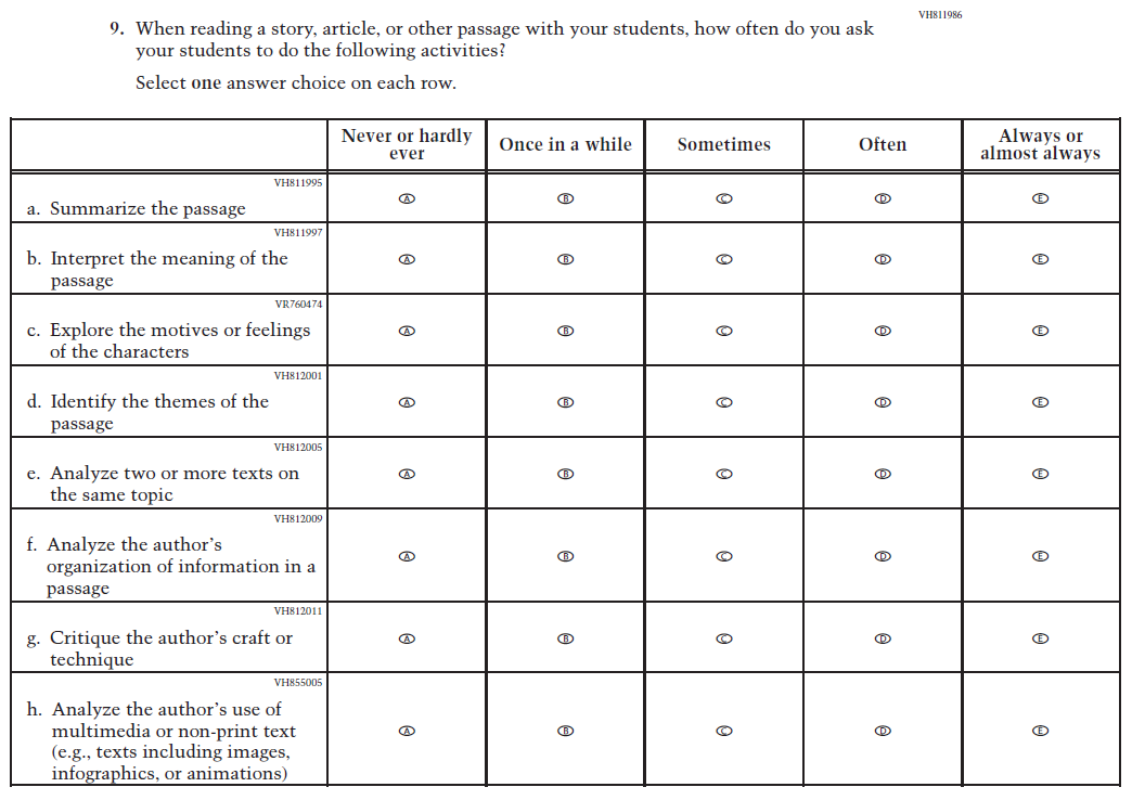 For 2026, we have aligned Inline Directions in Teacher and School Items with the Directions currently used in Student Items. The Item stem and subitem c were revised for clarity, and subitems f, g, and h were developed to measure content aligned with the new Reading framework. |