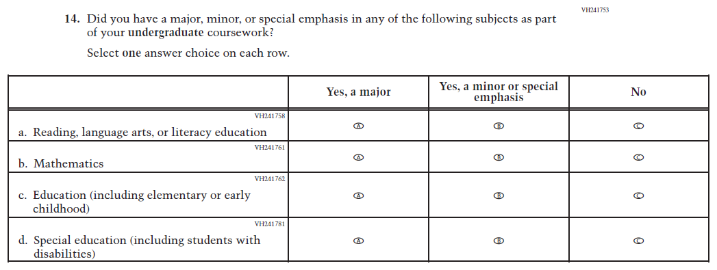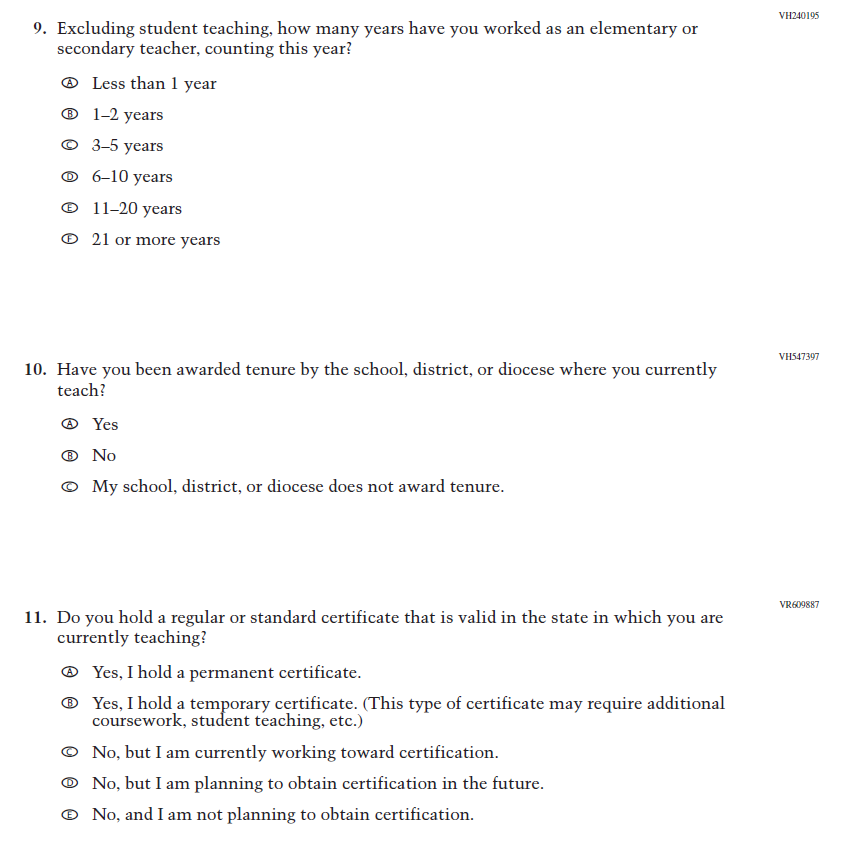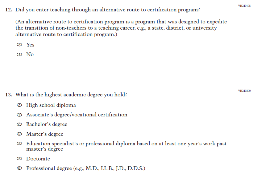 Appendix J2 provides the teacher survey questionnaires that will be administered in 2026, and any changes to the items from the 2024 administration are reflected in summary tables. Please note, some of the numbers of the items may be missing or out of order in these printed versions. This will be corrected in the platform view.