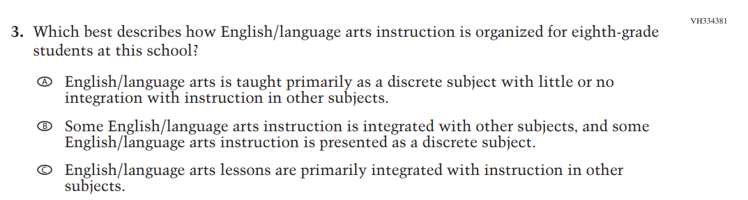 For 2026, we have aligned Inline Directions in Teacher and School Items with the Directions currently used in Student Items. The Item stem and subitem c were revised for clarity. |
