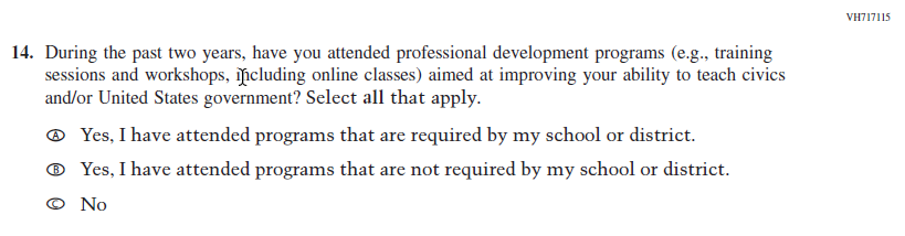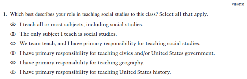 For 2026, we have aligned Inline Directions in Teacher and School Items with the Directions currently used in Student Items. This Item was revised to remove Science-related SubItems a through f and add Social Studies-related SubItems, since Science is not being administered in 2026, and Social Studies is. |