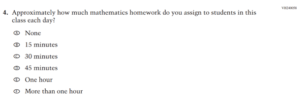 For 2026, we have aligned Inline Directions in Teacher and School Items with the Directions currently used in Student Items. The Item stem was revised for clarity, six subitems were kept, and new subitems were developed to measure content aligned with the new Mathematics framework. |