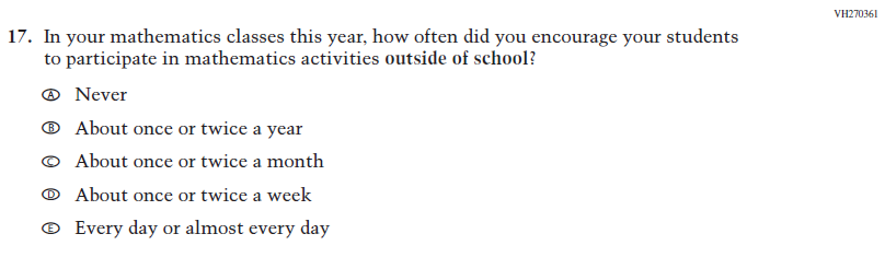 For 2026, we have aligned Inline Directions in Teacher and School Items with the Directions currently used in Student Items. The Item stem was revised for clarity and subItem f was developed to measure content aligned with the new Mathematics framework. |