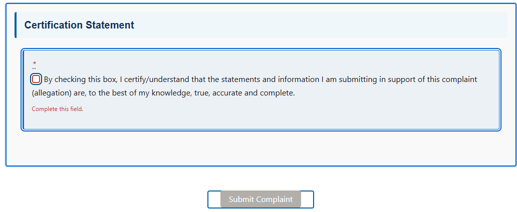 Complaint and Allegation Type Selections