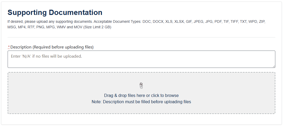 Complaints are filed voluntarily using the toll-free number or through the system website. Filers are asked to provide name and contact information (though neither is required) and selectable options associated with their complaint type to refine which one(s) of the allegations applies. Next, the filer is prompted to provide a narrative description of their issue and the proposed resolution in a free-form text box. The NCCDB also provides an option for the consumer to upload documentation to support their complaint. The documentation that a consumer chooses to upload may contain pictures, invoices, correspondence, and other evidence that supports the complaint allegation.