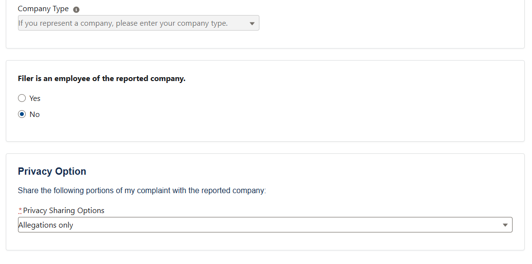 Option for the filer to have an individual submit a complaint on their behalf or mark that they wish to remain anonymous