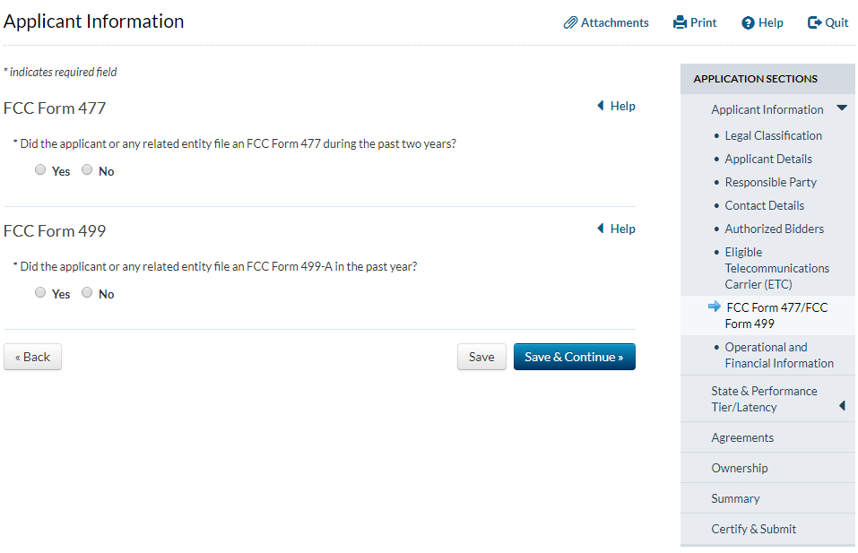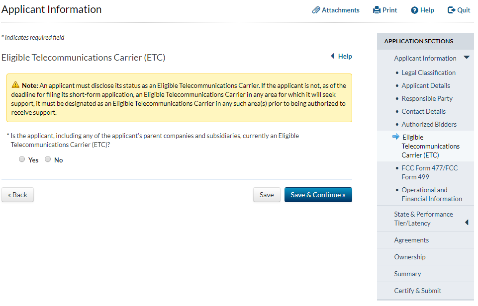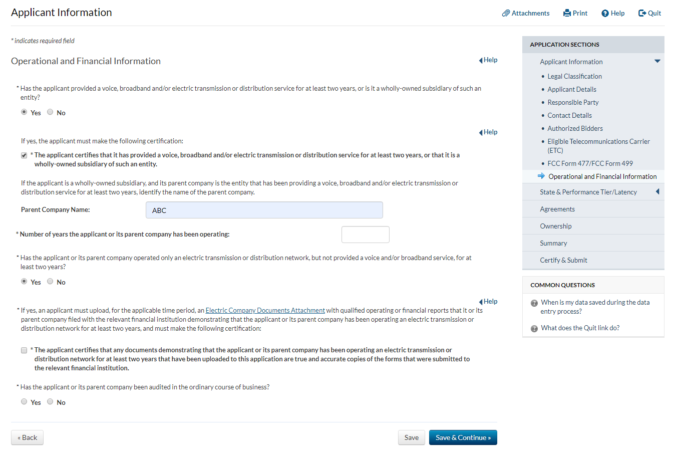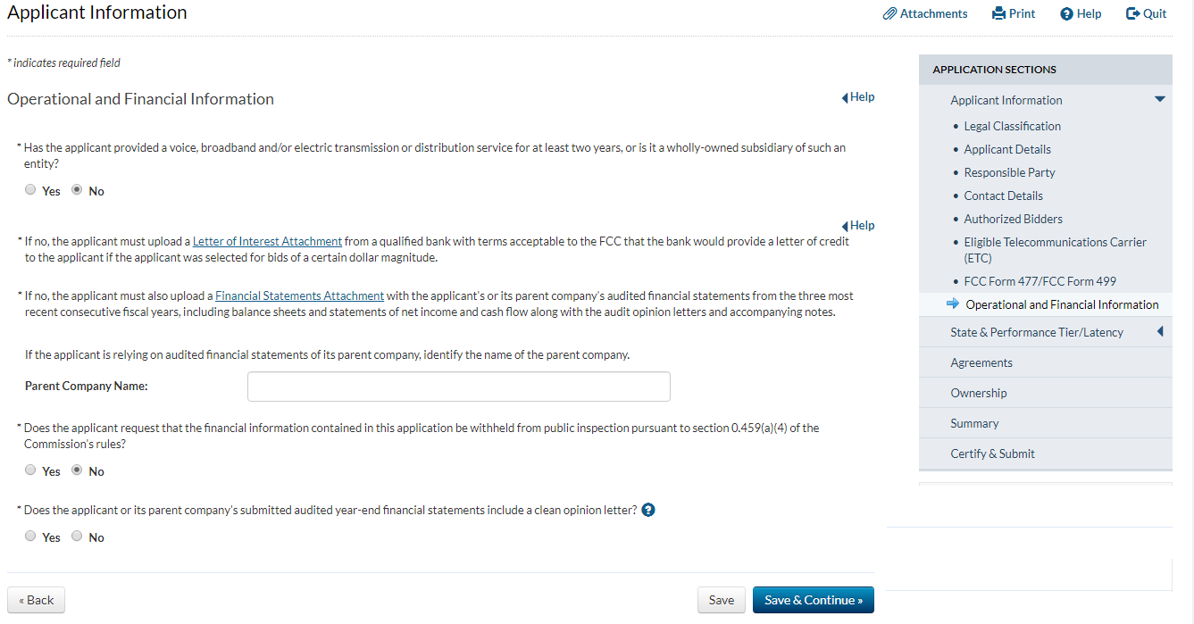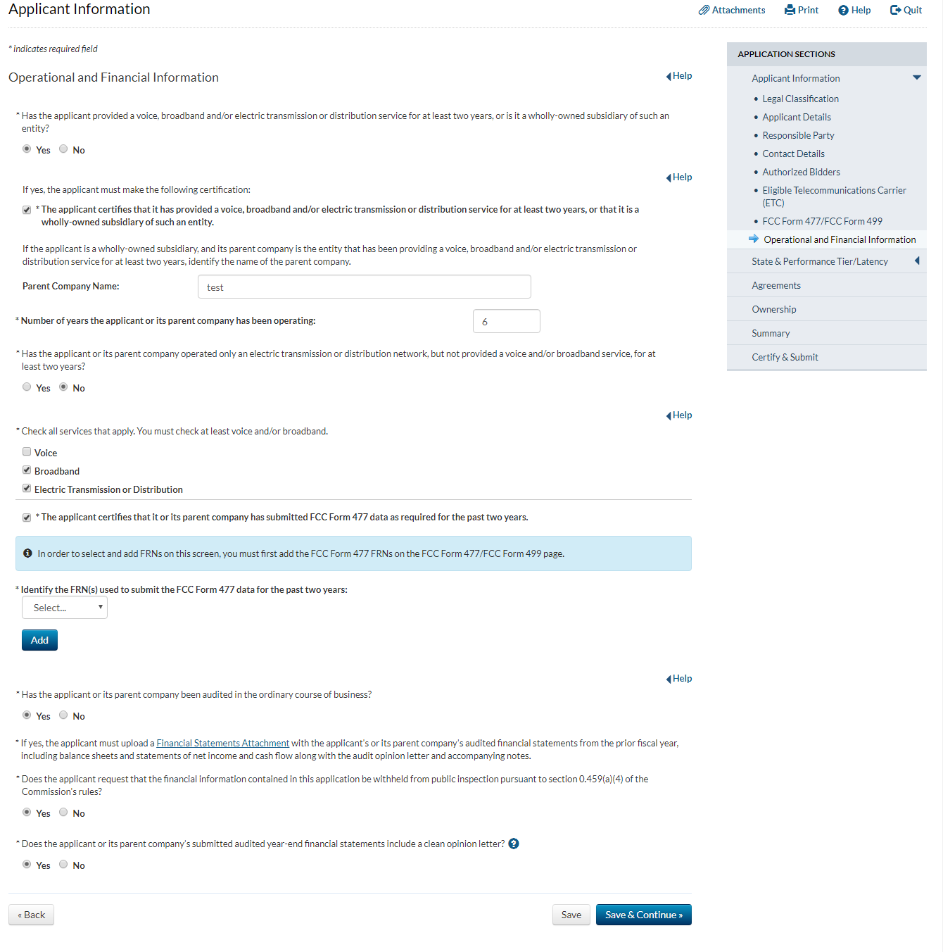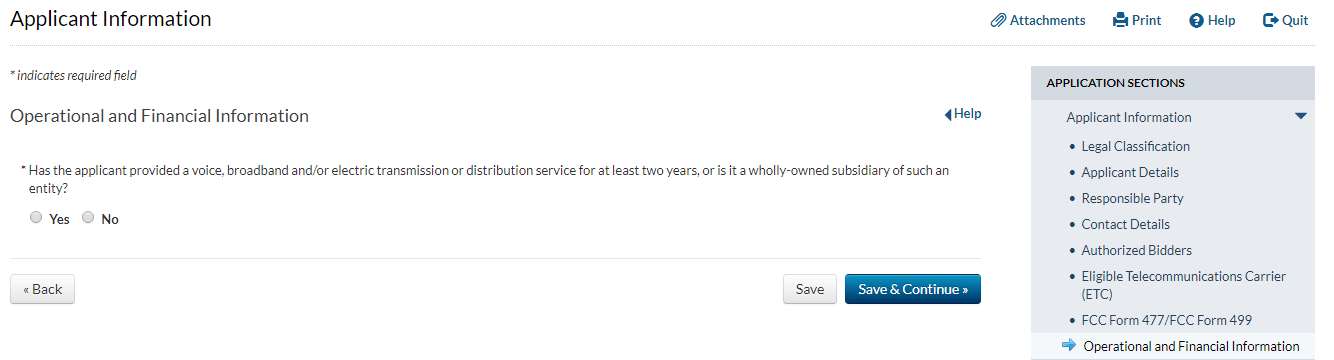Applicant answers ‘yes’ to the question that asks whether the applicant has provided service for at least two years and answers ‘no’ to the question that asks whether the applicant has operated only an electric transmission or distribution network