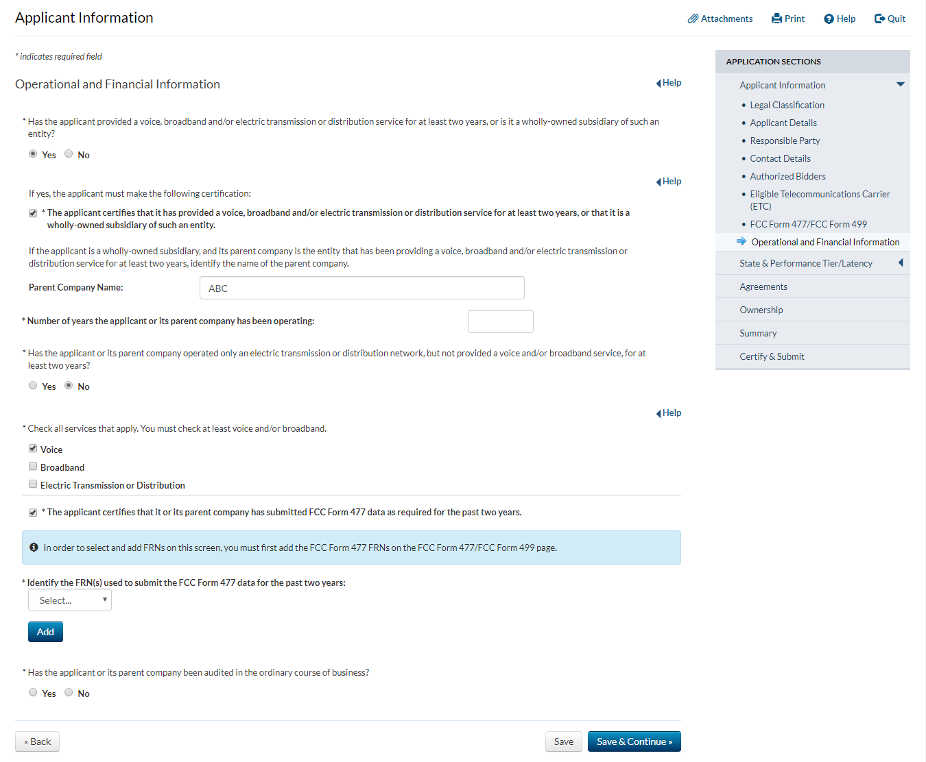 Applicant answers ‘yes’ to the question that asks whether the applicant has provided service for at least two years and answers ‘no’ to the question that asks whether the applicant or its parent company has been audited in the ordinary course of business