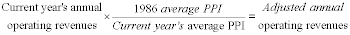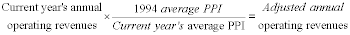 Note: Each carrier's operating revenues will be deflated annually using the Producers Price Index (PPI) of Finished Goods before comparing them with the dollar revenue limits prescribed in paragraph (a) of this section. The PPI is published monthly by the Bureau of Labor Statistics. The formula to be applied is as follows: