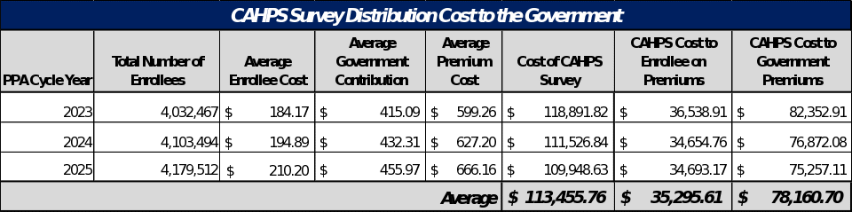 While there is no direct cost to the government for the CAHPS survey, there may be a very small percentage of costs paid from the government share of the premiums. To determine these costs, OPM calculated the total average government contribution costs from the previous three years (2023-2025) and multiplied it by the total number of enrollees who receive a government contribution towards their premiums.1 2 OPM also calculated the average enrollee contribution cost to their share of the premiums for 2023-2025. OPM computed the percentage of the government share of premiums and the percentage of the enrollee share of premiums. OPM applied these percentages to the total cost of the CAHPS Survey per year from 2023-2025, providing us with the overall total cost of the CAHPS survey allocated to enrollee share of premiums and the total CAHPS survey cost allocated to the government share of premiums.