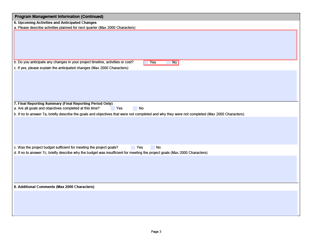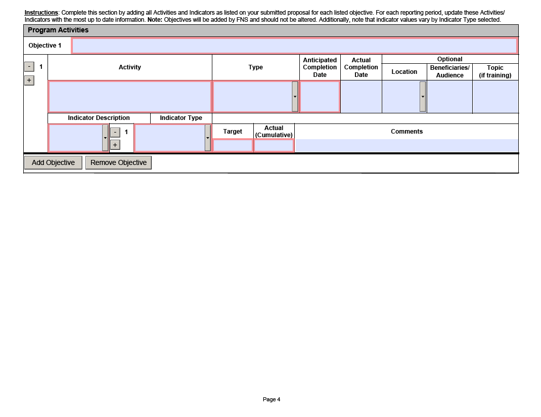 Please note: The FNS-908 PPR form specific to this opportunity will be sent to grantees at the time of award or the initial orientation. Use of the FNS-908 PPR form for progress reports is required. Previous grantees that have not submitted reports timely may be evaluated as high risk. All activities reported on the FNS-908 must align with the required objective(s) from the “Key Objectives” Section above.